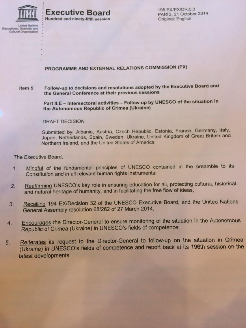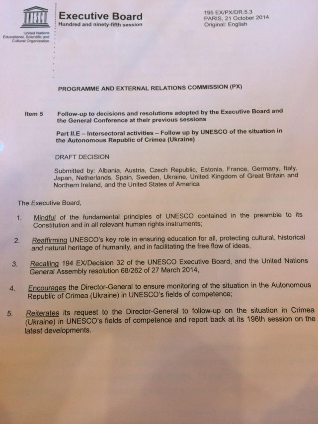 Організація Об'єднаних Націй з питань освіти, науки і культури (ЮНЕСКО) підтвердила те, що Автономна Республіка Крим належить Україні.