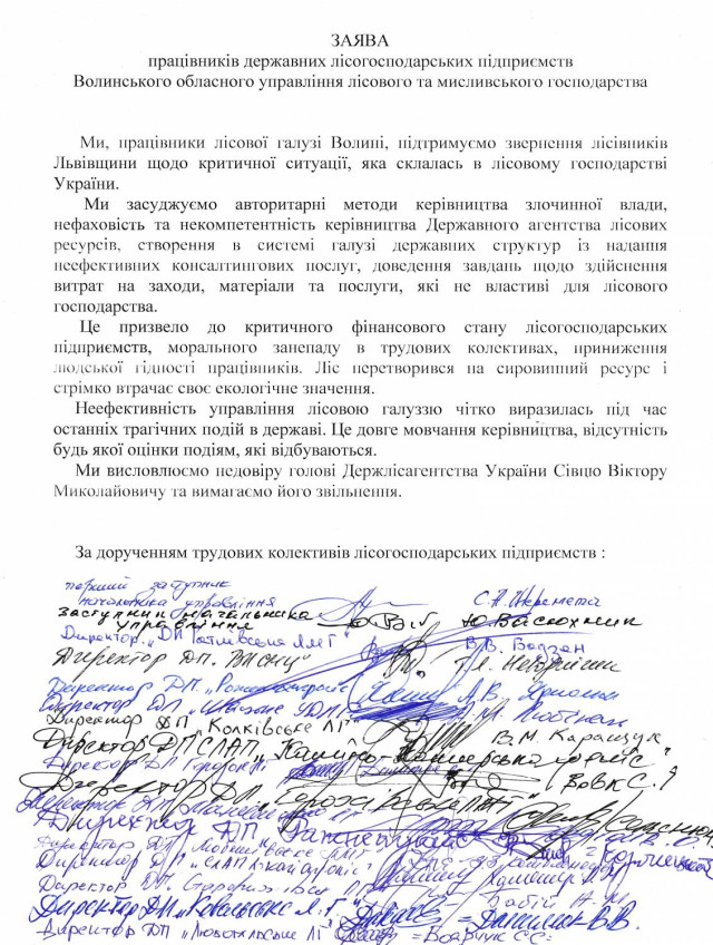 Також під час наради Сергій Шеремета зачитав заяву працівників державних лісогосподарських підприємств Волинського ОУЛМГ до Державного агентства лісових ресурсів України, в якій висловили недовіру його голові Віктору Сівцю та вимагають його звільнення.