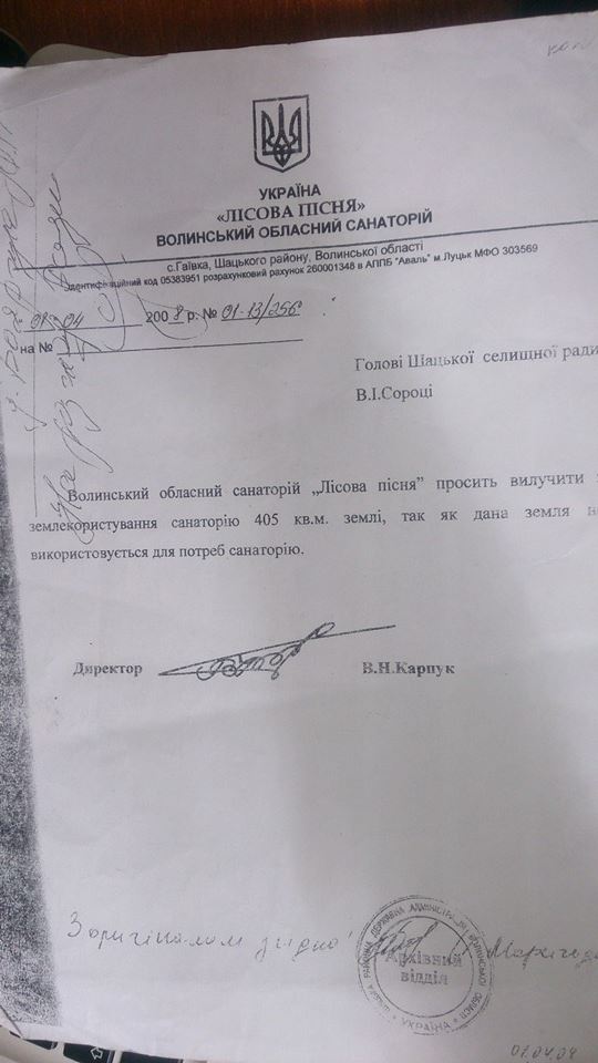 Після поїздки протягом тривалого часу Богдан Рущинський продовжував викривальну кампанію щодо директора санаторію. Зокрема, він надав мені копію звернення директора санаторію Віктора Карпука до голови Шацької селищної ради, де йдеться, що санаторій просить вилучити з землекористування 405 квадратних метрів землі, бо вона не потрібна. Як стверджував активіст Богдан Рущинський, згодом Шацька рада безоплатно надала цей шматок землі комусь із родичів Карпука.