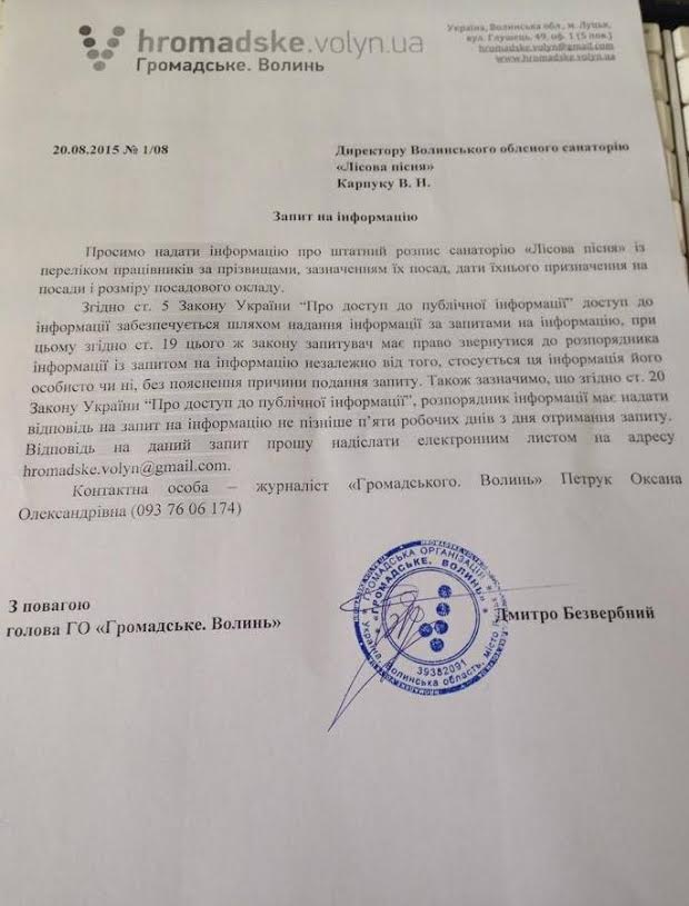Саме вони стали поштовхом для того, щоб написати офіційний запит на ім’я директора, в якому «Громадське. Волинь» просило надати інформацію про штатний розпис санаторію «Лісова пісня» із зазначенням посадових окладів. Перший запит був надісланий на електронну пошту санаторію. Про отримання свідчить дзвінок керівнику ГО «Громадське Волинь» від Віталія Захарченка, який, за словами інсайдера, у той час заміщав директора, бо той був відсутній. Захарченко сказав, що на бланку запиту слід поставити печатку організації, а також наполягав на особистій зустрічі. Поставили печатку і запит відправили повторно. Але ні першого, ні наступного разу від керівництва санаторію не дочекалися навіть відписки. Втретє надіслали листа поштою. Теж без відповіді.