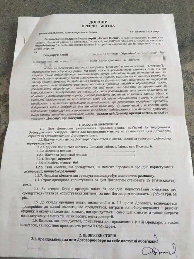 Нині мені стало відомо, що у п’ятницю Громадська рада при ОДА збереться знову поговорити про «Лісову пісню» і про реабілітаційний центр. Інсайдер каже, що «активісти» знають, що я володію копією документу на оренду житла в санаторії терміном на 15 років. І вони вже знайшли аргументи, як довести, що він фіктивний. Звісно, що кращий захист – це напад. Та нехай. Ось копія договору.