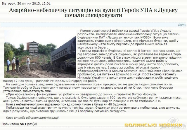 «Після зміни русла Стиру частина нинішньої вулиці Героїв УПА у Луцьку, в районі Вишкова, опинилася над урвистим берегом. Цьогорічна зима прискорила процес руйнування. В одному місці розмоклий ґрунт зсунувся. Там, де нещодавно був плавний схил, довелося побачити різке урвище. Тріщини пішли вздовж берега. Навіть той клапоть, на якому ми стоїмо, раніше чи пізніше поповзе у воду», - саме таку картину довелося побачити кореспонденту Волині-нової торік у квітні.