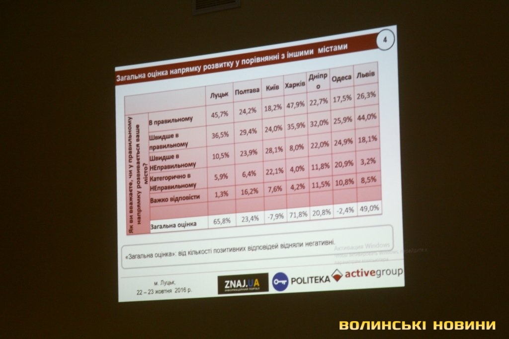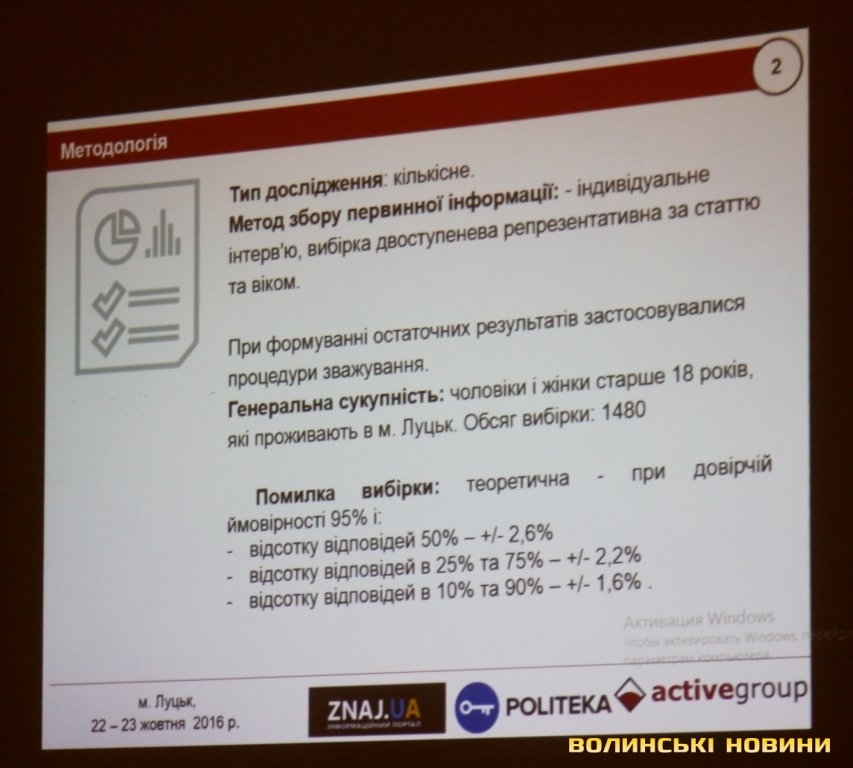 Керівник соціологічної кампанії, засновник Центру досліджень та комунікацій «Active Group» Андрій Єременко повідомив, що заміри здійснювали у п’яти великих містах. У Луцьку зробили репрезентативне опитування 1480 респондентів - чоловіків та жінок віком понад 18 років, які проживають у Луцьку, з похибкою в 2,2-2,4%.