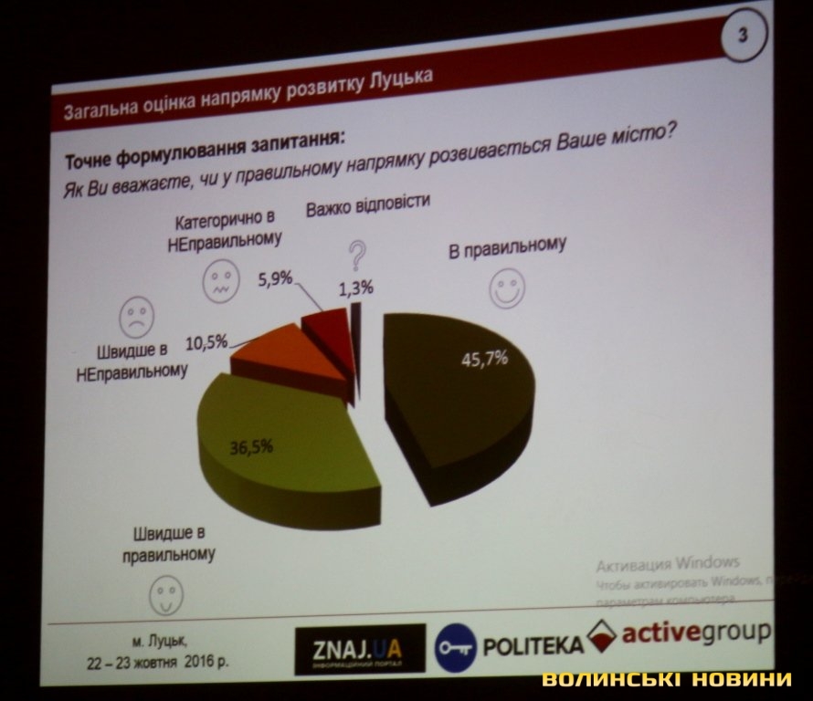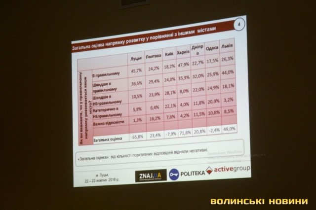 Серед питань, які ставили лучанам: «чи у правильному напрямку розвивається ваше місто?». Так, 45,7% опитаних вважають, що у правильному, 36,5% - «швидше у правильному». Таким чином, лучани належать до найбільш оптимістичних з опитаних, порівняно з Києвом, Полтавою, Дніпром, Одесою та Львовом. Лише у Харкові відсоток респондентів, які вважають, що місто розвивається у правильному напрямку становить 47,9% (експерти це пояснюють майже повною відсутністю опозиційних до міської влади ЗМІ у Харкові).