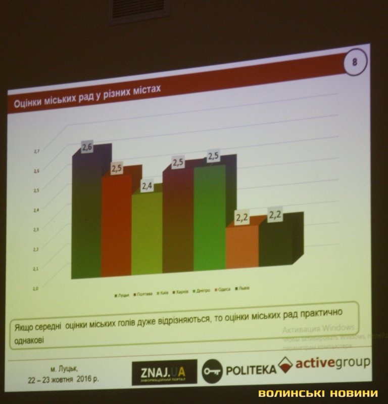 Традиційно нижчі показники оцінки роботи міської ради, адже депутати, здебільшого, менш відомі мешканцям міста, ніж міський голова. Так, у Луцьку середня оцінка діяльності міськради становила 2,62 (на 3 бали її діяльність оцінили 40,7% респондентів).