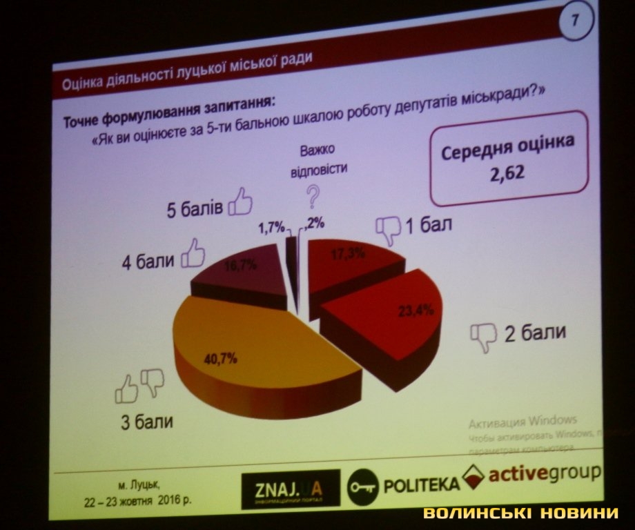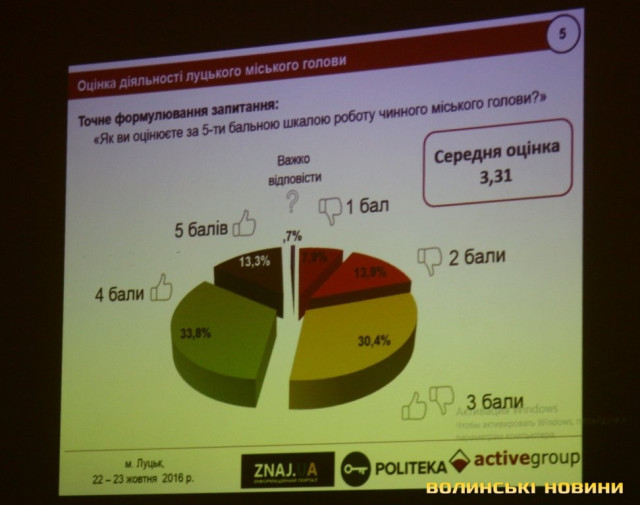 Роботу міського голови за п’ятибальною шкалою оцінили на 5 балів 13,3% опитаних у Луцьку, на 4 бали – 33,8%, на 3 бали – 30,4%, на 2 бали – 13,9%. Середній бал таким чином становить 3,3, що нижче, ніж у Харкові (3,4), але вище, ніж в Одесі (2,6) та Києві (2,9).