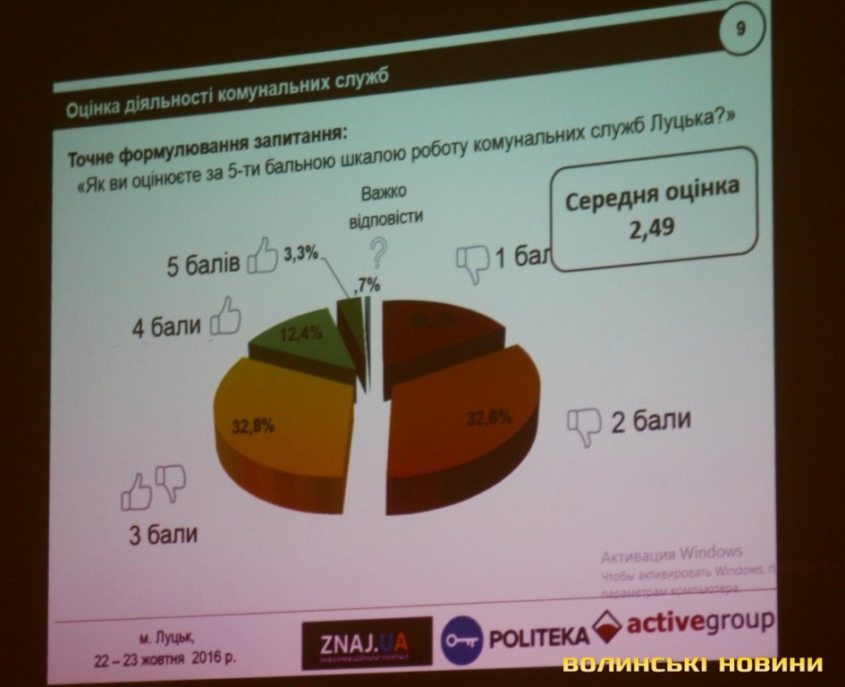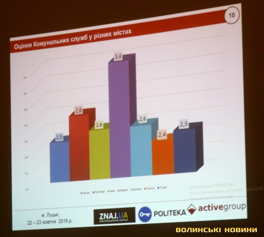 Найнижчу оцінку лучан (2,49) отримали комунальні служби. Цей показник нижчий, ніж у Полтаві (2,8), Києві (2,6), Харкові (3,4), Дніпрі (2,6), але дещо вищий, ніж в Одесі (2,4).
