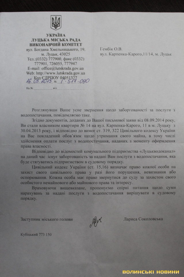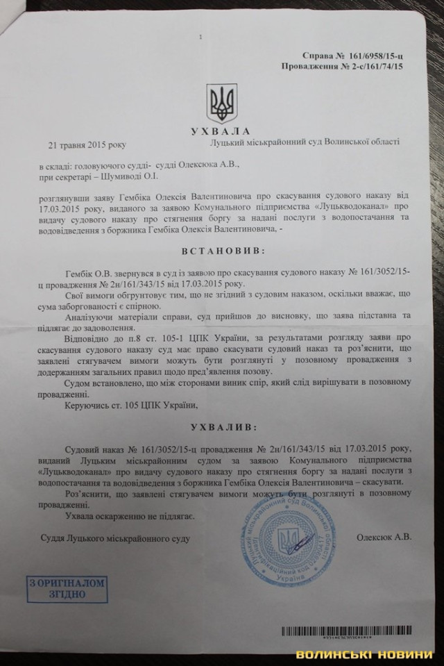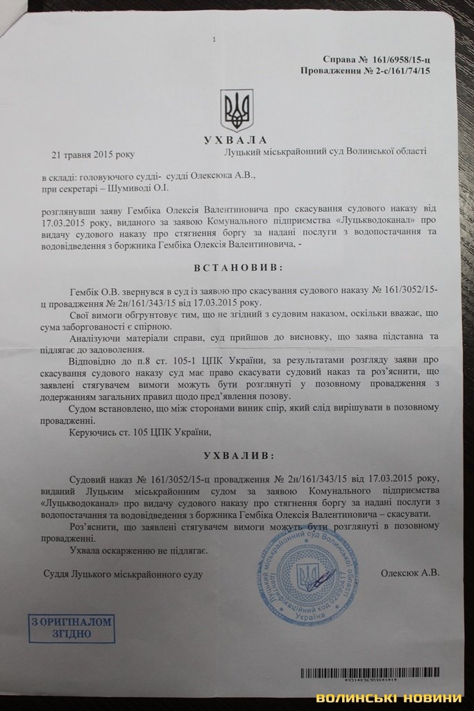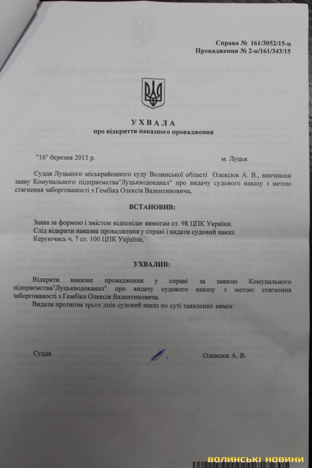 Аби отримати гроші зі споживача, КП «Луцькводоканал» звернувся в суд. Так, феміда 16-го березня 2015 року ухвалила видати судовий наказ, аби стягнути заборгованість з Гембіка Олексія Валентиновича.Містянин обурився таким свавіллям й звернувся за підтримкою в Луцьку міську раду. Втім, ті й не бралися розбиратися, «відшили» лучанина у напрямку суду.