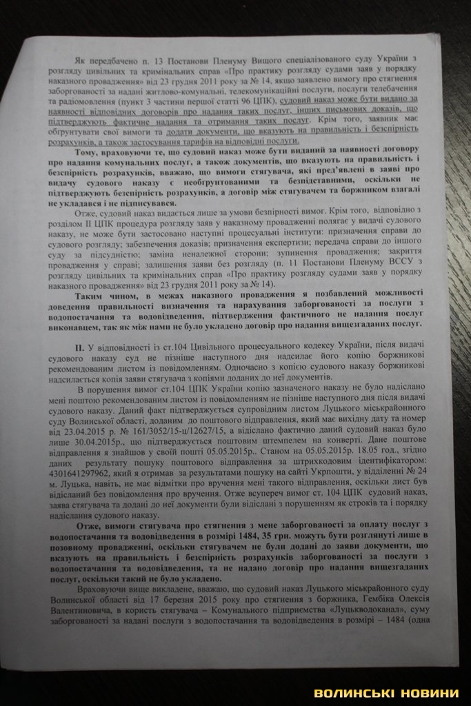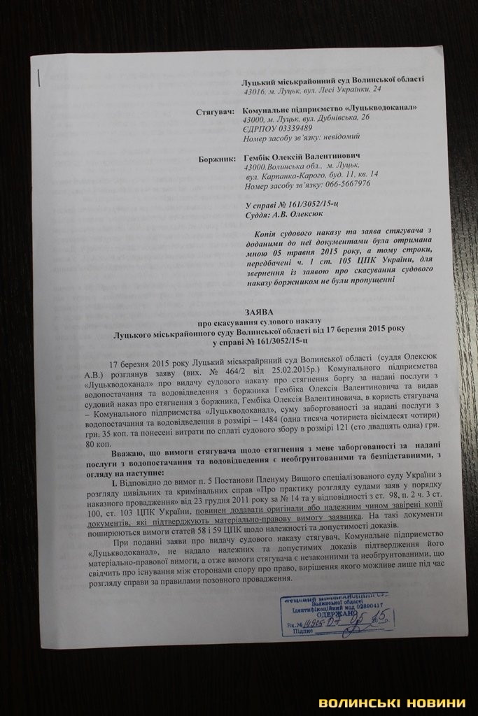 «Пропонуємо спірні питання щодо суми нарахувань за надані послуги з водопостачання вирішувати в судовому порядку», – сказала у своїй відповіді заступник Луцького міського голови Лариса СоколовськаЗваживши на такий стан справ, Олексію Гембіку таки довелося втягнутися у судову тяганину, аби відстояти свої права. Так, чоловік звернувся у Луцький міськрайонний суд Волинської області про скасування судового наказу. Свої вимоги обґрунтовує тим, що не згідний з рішенням феміди про стягнення з нього боргу, оскільки вважає, що сума заборгованості надумана.