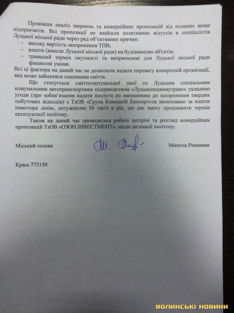 Однак жодна з пропозицій не знайшли позитивних відгуків в спеціалістів Луцької міської ради. Об’єктивними причинами відмови цим компаніям, йдеться у відповіді міськради, - це фінансове навантаження на бюджет міста, зокрема, висока вартість захоронення ТПВ, внесок Луцької міської ради на будівництво об'єктів, тривалий термін окупності та неприйнятні для Луцької міської ради фінансові умови.