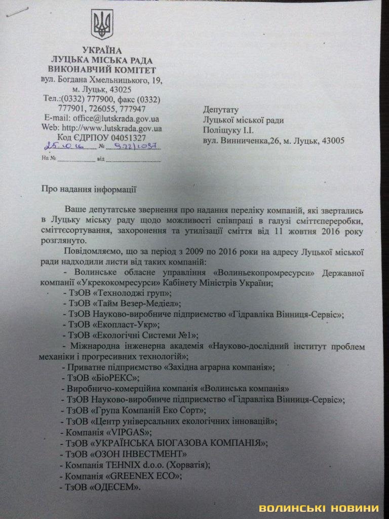 У відповіді за підписом міського голови Миколи Романюка йдеться, що за період з 2009 по 2016 роки на адресу Луцької міської ради надходили листи від 19 таких компаній, як вітчизняних, так і іноземних. Зокрема, це: