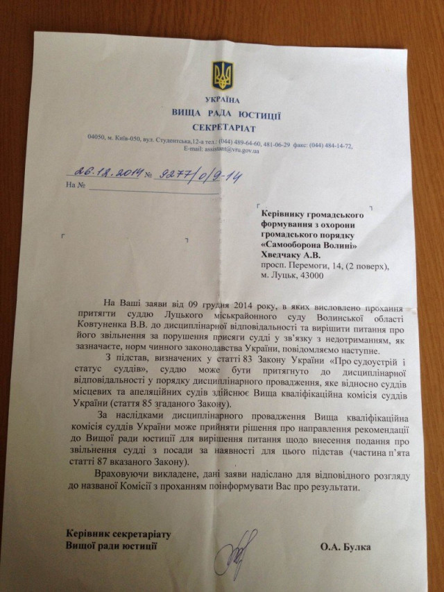 Активісти Самооборони Майдану Волині зібрали необхідні документи, що свідчать про недобросовісну роботу судді Віталія Ковтуненка, - повідомили у прес-службі організації.