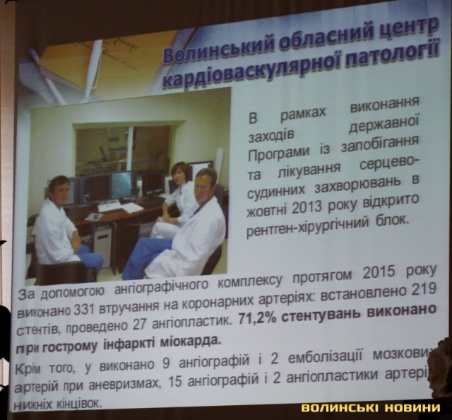 Як повідомив депутатам завідувач обласного центру кардіоваскулярної патології Андрій Ягенський, центр розпочав роботу наприкінці листопада 2013 року. Центр працює цілодобово, вартість одного стентування відрізняється залежно від випадку. Серед пацієнтів 80% становлять мешканці Луцька, решта – мешканці районів. Як зауважив лікар, серед нестентованих хворих смертність становить 17%, стентованих – лише 3,5%. Проблема полягає у фінансуванні закупівлі стентів – часто пацієнт не має змоги негайно оплатити їх купівлю за власні кошти. Стенти, які надійдуть приблизно через місяць, не покриють усіх потреб центру, роботу якого не можна зупиняти, адже йдеться про врятування людей.