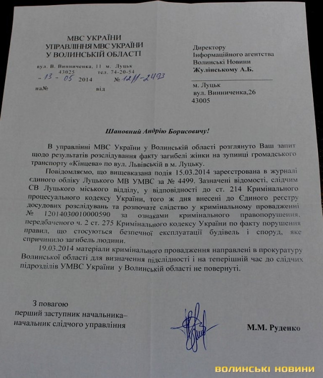 У відповіді зазначено, що подія зареєстрована в журналі єдиного обліку Луцького МВ УМВС за № 4499, того ж дня його внесли й до Єдиного реєстру досудових розслідувань.