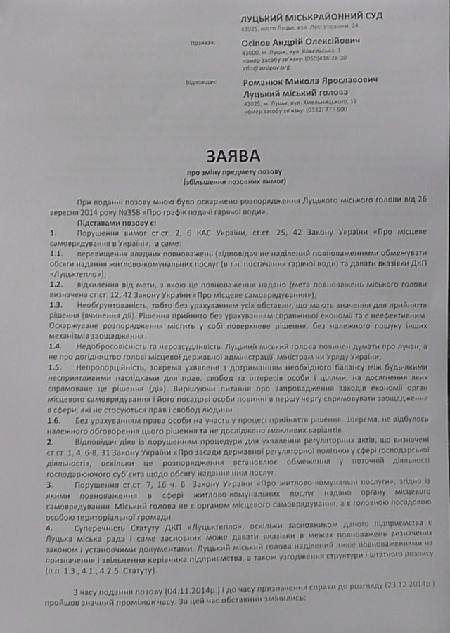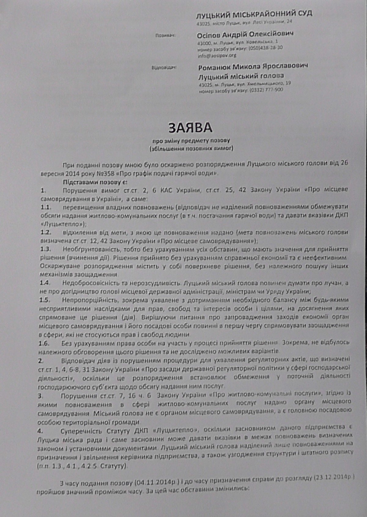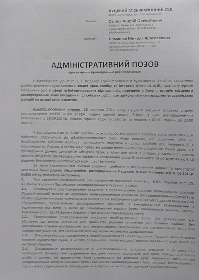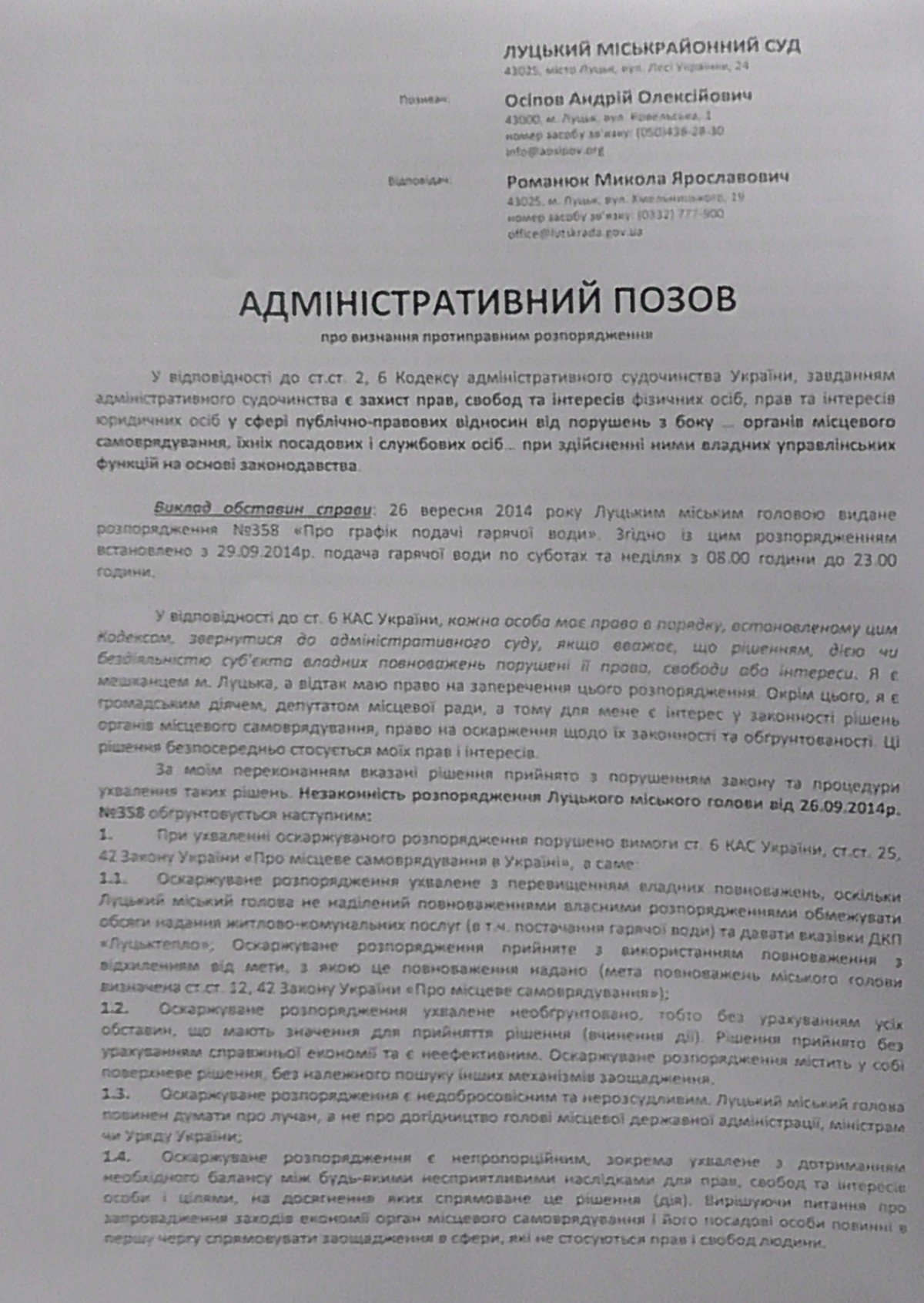 У своєму коментарі депутат відмітив, що сам позов до суду вже дав позитивні результати, адже розпорядженням міського голови від 26 вересня 2014 р. лучанам почали подавати гарячу воду у вихідні дні, а зараз вона є в усі дні, окрім нічного часу з 22-ої до 8-ої ранку.