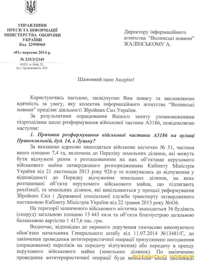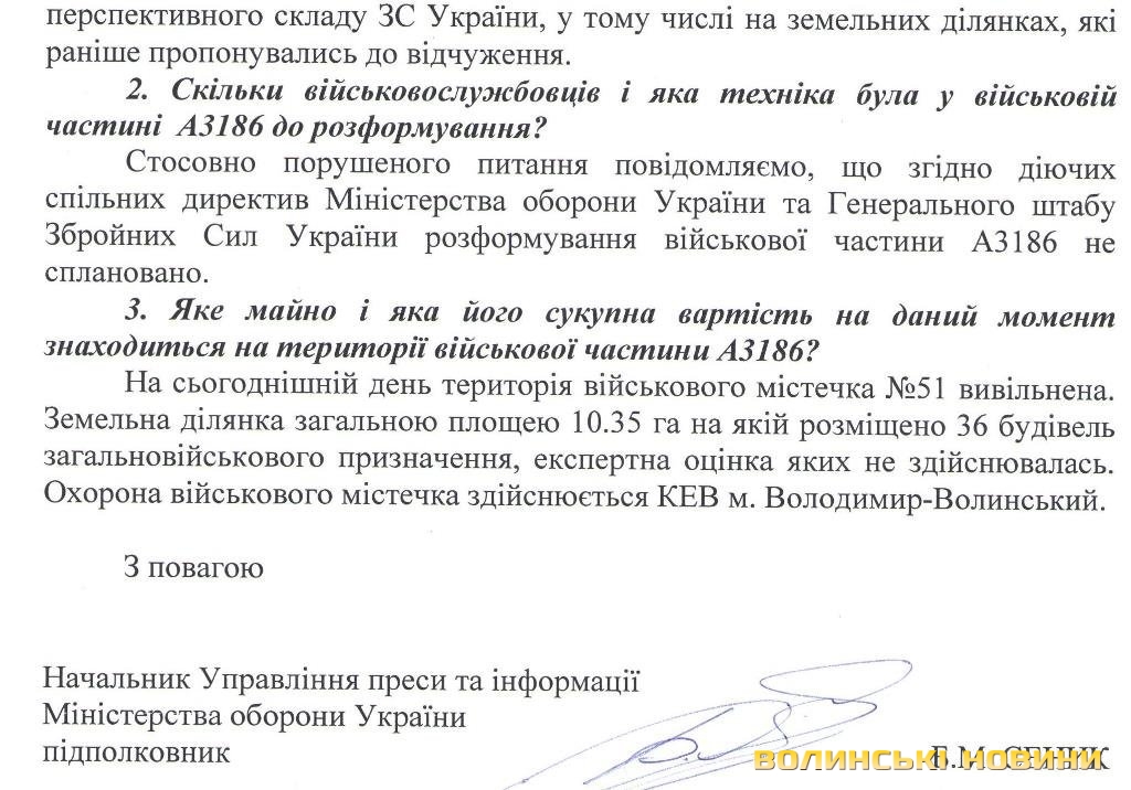 У відповіді йдеться: «За вказаною адресою знаходиться військове містечко № 51, частина якого площею 7.4 гектара, включена до Переліку земельних ділянок, які можуть бути відчужені разом з розташованими на них об’єктами нерухомого військового майна відповідно до розпорядження Кабміну від 21-го листопада 2013-го року 926-р., та Порядку відчуження земельних ділянок, які вивільняються у процесі реформування Збройних Сил і державної спеціальної служби транспорту, затвердженого постановою Кабміну від 22 червня 2013-го року № 436».Зауважимо, що в документах зазначено і про можливість передачу майна в оренду.