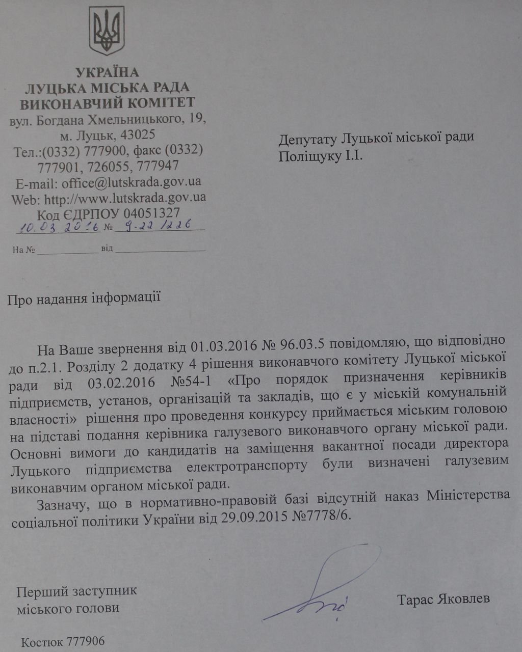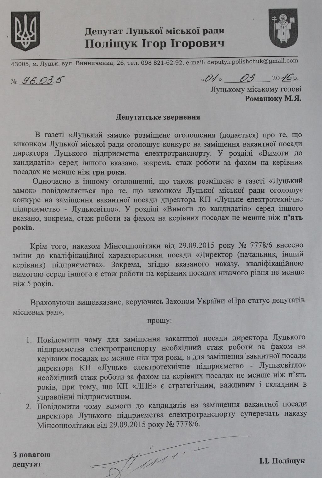 Щоб з’ясувати цю обставину, Поліщук подав депутатське звернення, на яке отримав відповідь про те, що «основні вимоги до кандидатів на заміщення вакантної посади директора ЛПЕ були визначені галузевим виконавчим органом міської ради»Зі слів депутата, це свідчить про те, що умови конкурсу були прописані під конкретну людину. Попри це, колектив підприємства при призначенні на посаду керівника просить врахувати його думку та рекомендують кандидатуру Володимира Пуца. До слова, під цим зверненням підписалось 197 працівників ЛПЕ.