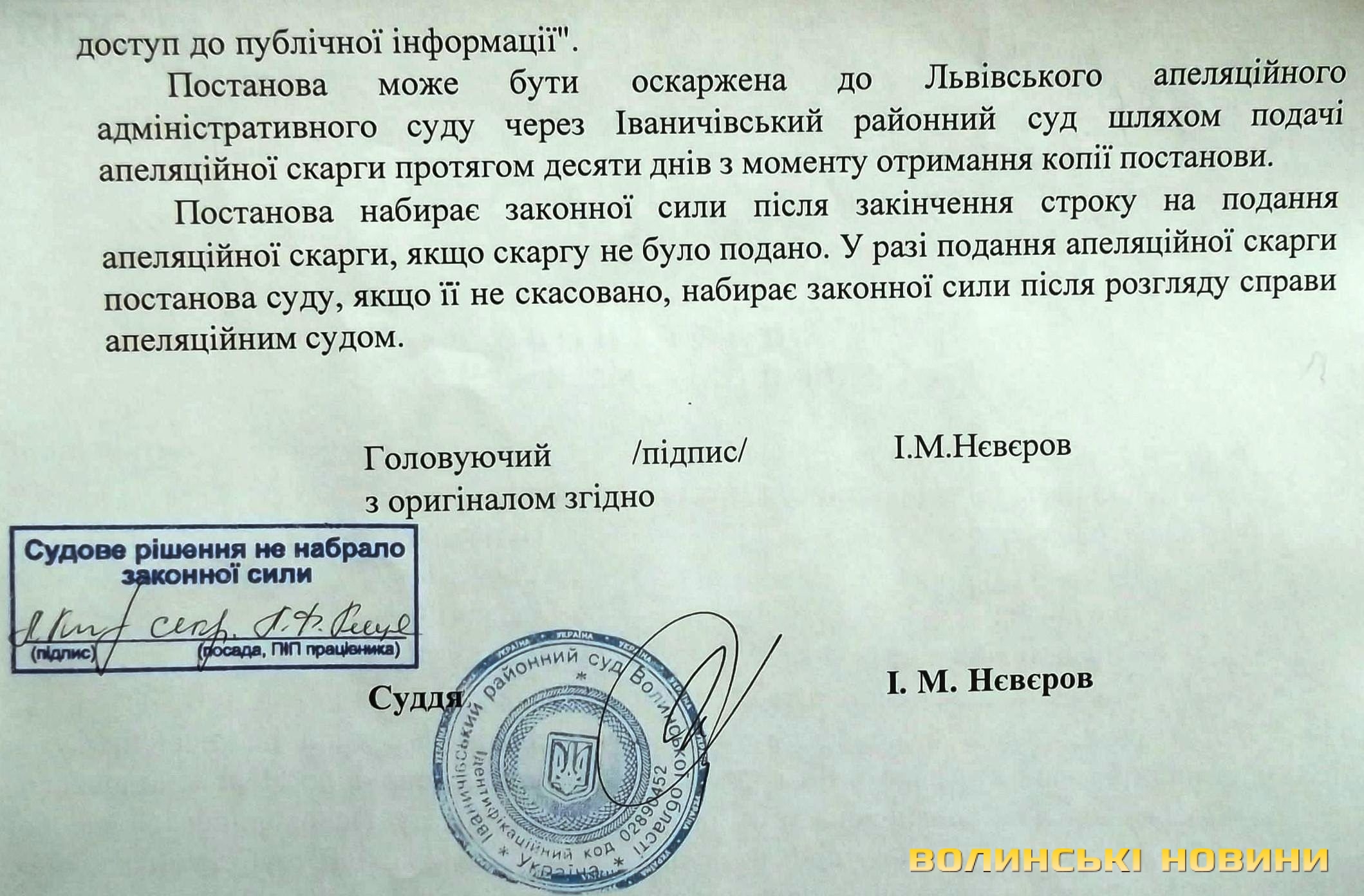Інформацію про рішення суду та скановані копії документів Інформаційне агентство Волинські Новини отримало з власних джерел.