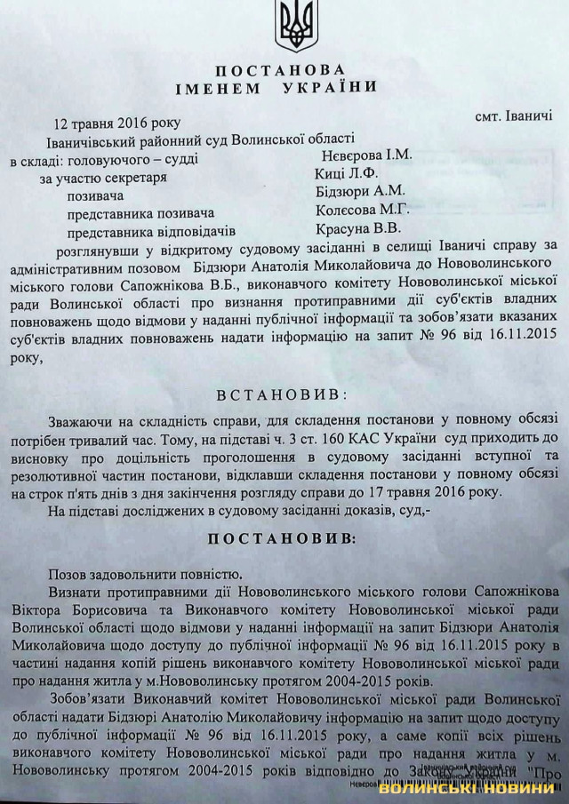 Нагадаємо, Анатолій Бідзюра подав адміністративний позов до нововолинського міського голови Віктора Сапожнікова про визнання протиправною його бездіяльності на посаді міського голови, у зв’язку із ненаданням відповідей на його інформаційні запити про розподіл комунальних квартир громадянам та місцевим і державним службовцям у місті Нововолинську за період із 2004 по 2015 роки. «Визнати протиправними дії Нововолинського міського голови Сапожнікова Віктора Борисовича та Виконавчого комітету Нововлинської міськох ради щодо відмови у наданні інформації на запит Бідзюри Анатолія Миколайовича щодо доступу до публічної інформації №96 інформацію від 16.112015 року в частині наданні копій рішень виконавчого комітету Нововлинської міськох ради про надання житла у місті Нововолинську службовцям у місті Нововолинську протягом 2004-2015 років», - йдеться у постанові.