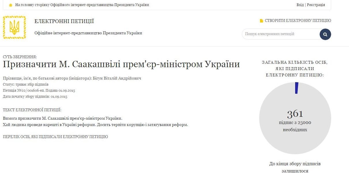 Петиція з вимогою призначити Саакашвілі прем’єр-міністром України, під якою може підписатися будь-який громадянин України, вже розміщена у вільному доступі на офіційному сайті президента України Петра Порошенка.
