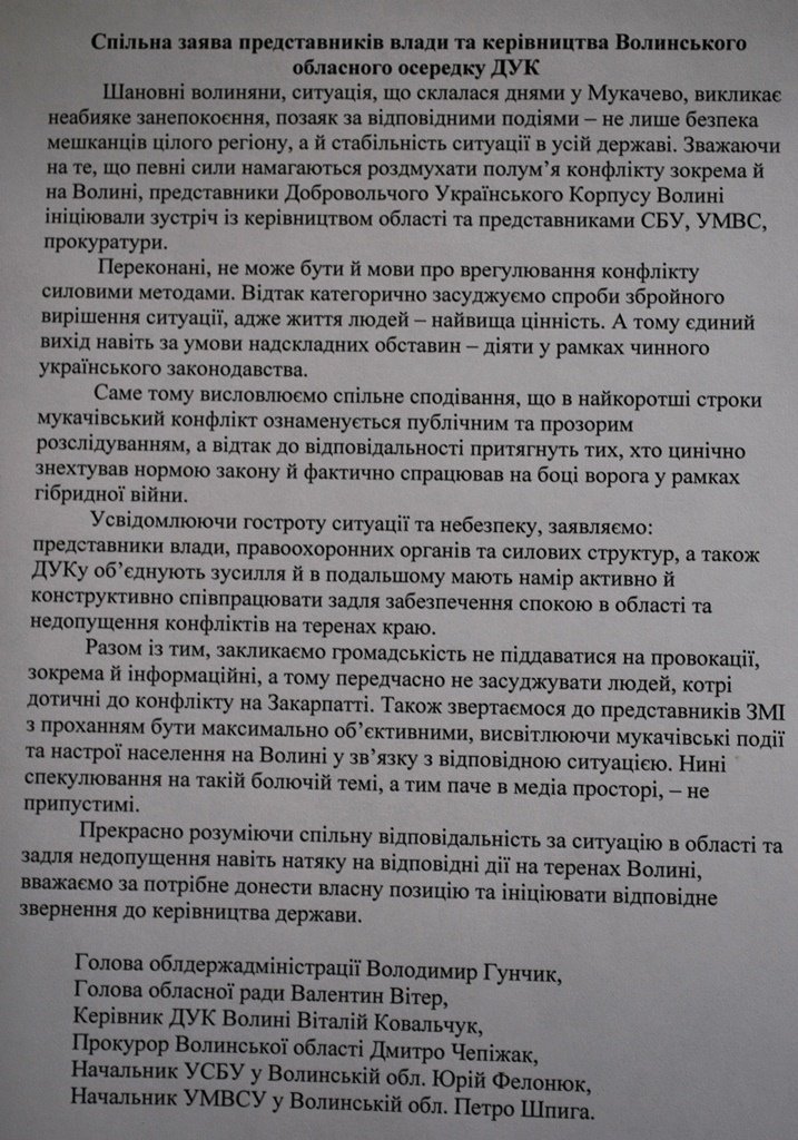«Шановні волиняни, ситуація в Мукачевому викликає занепокоєння щодо стабільності ситуації в державі. Є певні сили, які хочуть розхитати ситуацію і на Волині. Ми категорично засуджуємо збройне вирішення конфлікту. Тому необхідно діяти в рамках чинного законодавства. Очікуємо, що ситуація у Мукачевому розслідуватиметься прозоро.