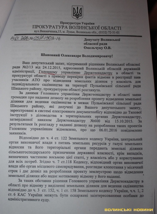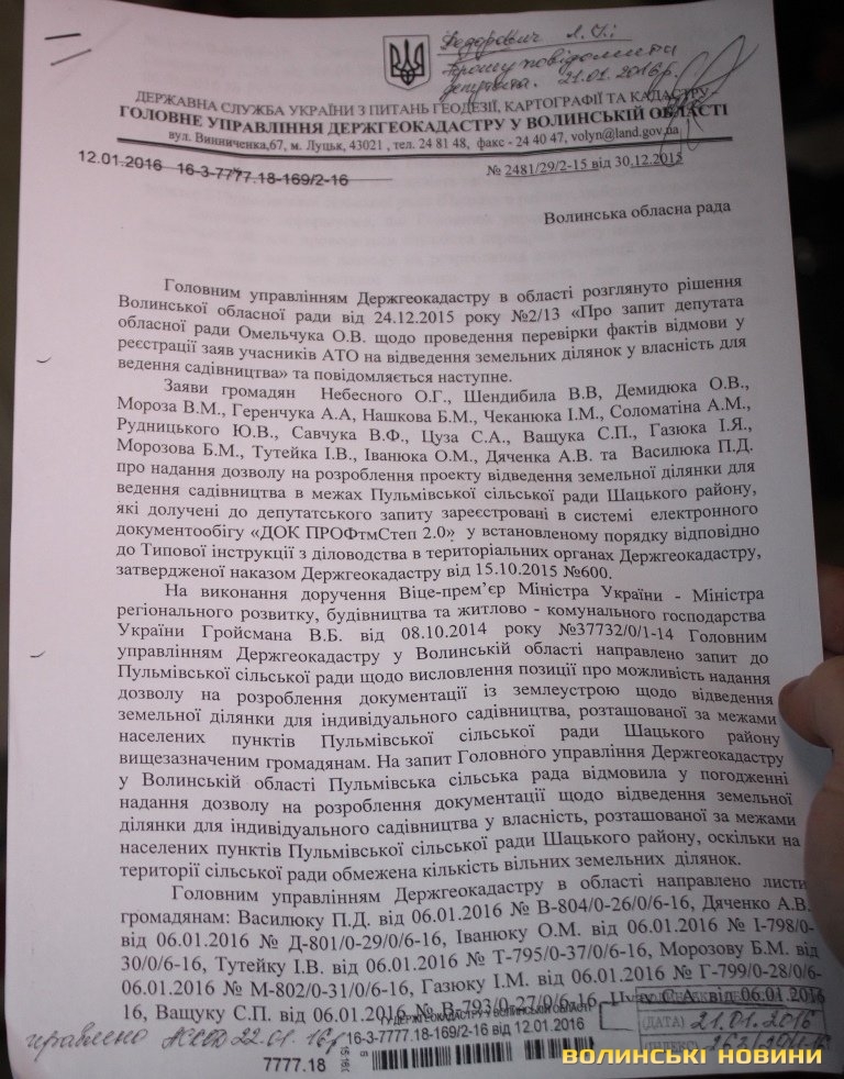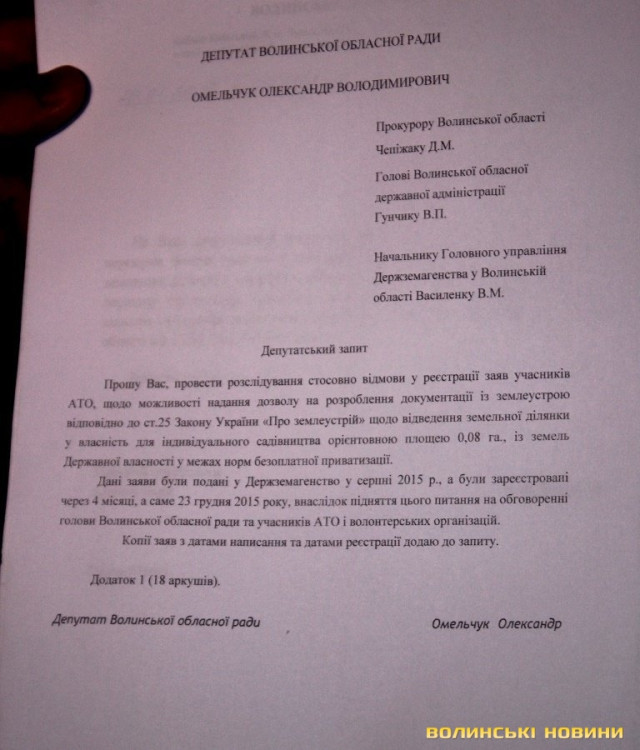 Зрозумівши, що самому складно подолати «бюрократичну машину», звернувся за допомогою до депутата обласної ради від Волинської обласної регіональної політичної партії «Українське об’єднання патріотів – УКРОП» Олександра Омельчука.«У цій справі я побачив очевидне порушення законів України. Люди в травні звернулися, їм давали обіцянки, що все буде гаразд, а поки ті в грудні не пішли шукати свої заяви – їх не реєстрували. Таким чином, воїнів АТО вводили в оману. Можливо, це зробили для того, щоб притримати унаділи для «потрібних» людей з інших областей, хто б мав за це якусь винагороду. Зваживши на все це, я направив депутатський запит у прокуратуру й Держземкадастр», – коментує ситуацію обранець громади.На запит депутата Олександра Омельчука в Держземкадастрі відповіли, що заяви зареєстровані вчасно у системі електронного документообігу у встановленому порядку відповідно до типової інструкції.