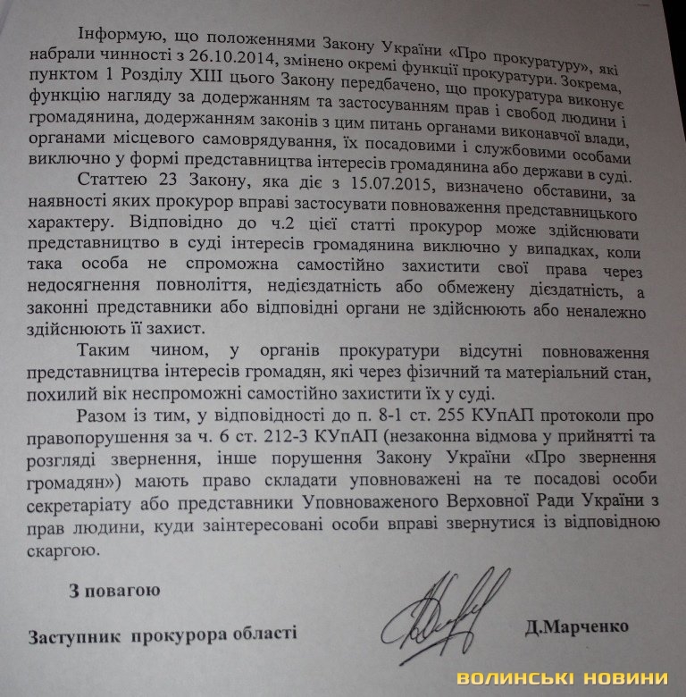 «Положеннями Закону України «Про прокуратуру», які набрали чинності з 26.10.2014 року в органів прокуратури відсутні повноваження представництва інтересів громадян», – йдеться у відповіді на звернення.Втім, правоохоронці зауважили важливу деталь, що відповідно до частини 7 статті 118 Земельного кодексу України, розгляд заяви мав відбутися у місячний строк, після цього б учасники АТО мали б отримати дозвіл на розроблення проекту землеустрою щодо відведення земельної ділянки або мотивовану відмову у його наданні. Зауважимо, що й негативна відповідь – теж не є останнім словом, адже рішення можна оскаржити в адміністративному суді.