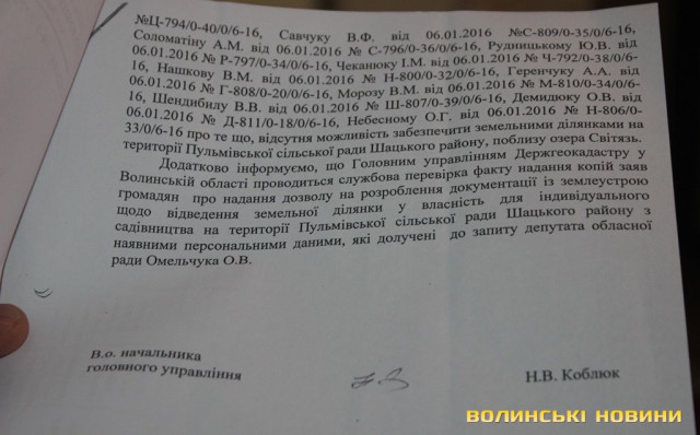 Питання почали ставити начальнику управління землеустрою та охорони земель головного управління Держземкадастру на Волині Нелі Коблюк. Чиновниця вперто відповідала, що всі заяви зареєстрували.