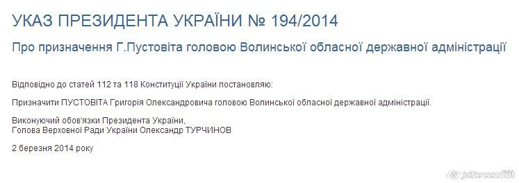 Григорія Пустовіта призначили головою Волинської ОДА сьогодні 2 березня.