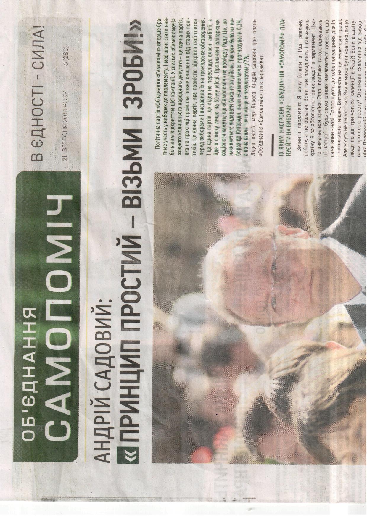 Наприклад, в поштових скриньках багатоповерхових будинків в спальних районах Луцька на початку жовтня розповсюджувалися газети з агітацією за Об’єднання «Самопоміч». В газеті міститься інформація про те, що партія бере участь у виборах та вказані кандидати в депутати з першої десятки виборчого списку. Видавцем цієї газети значиться ГО «Об’єднання «Самопоміч». І хоча датою виходу газети вказано 21 вересня, а партія зареєстрована в ЦВК лише 25 вересня, однак, розповсюджували цю поліграфію вже в перших числах жовтня.