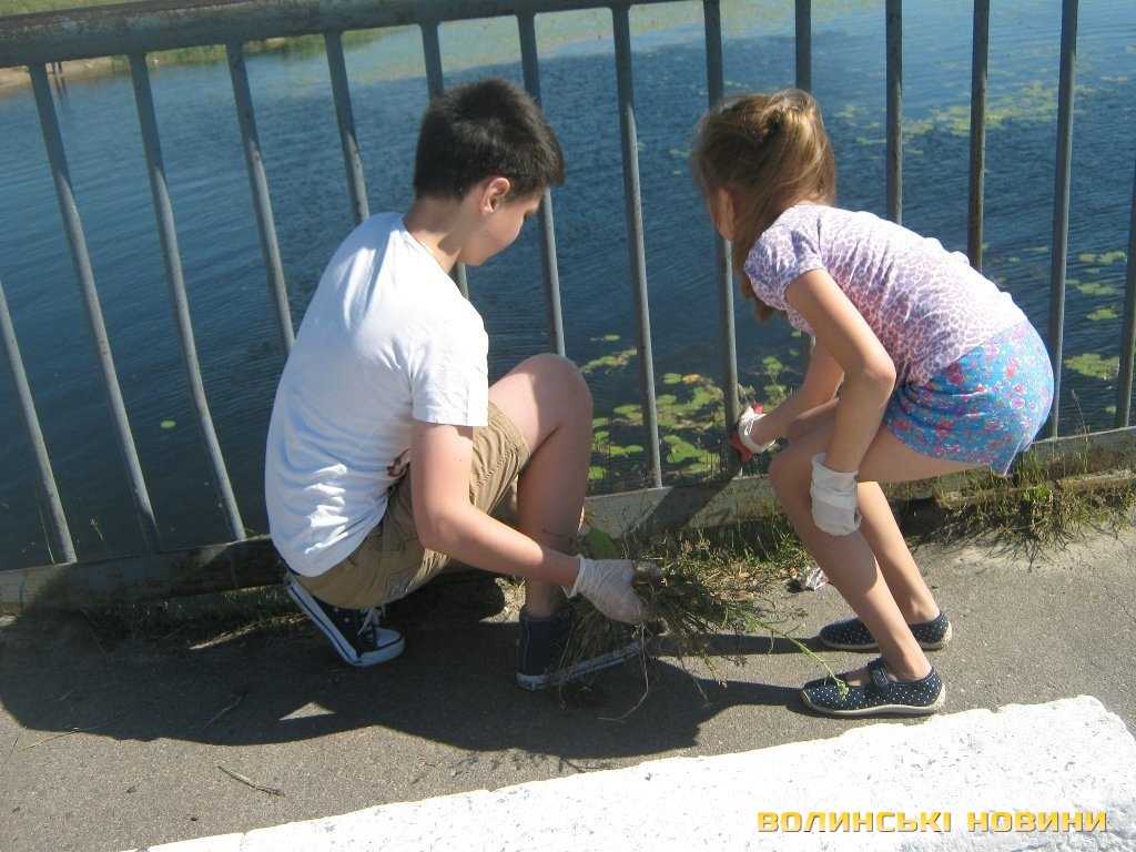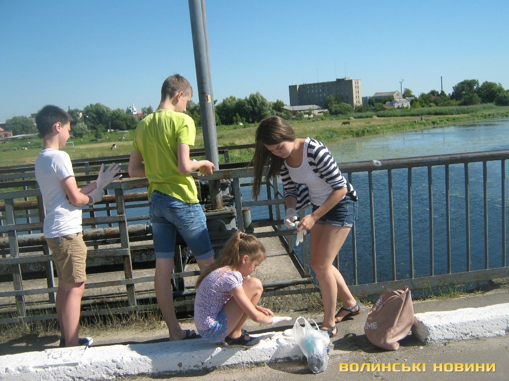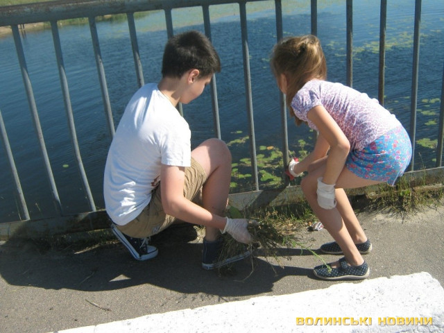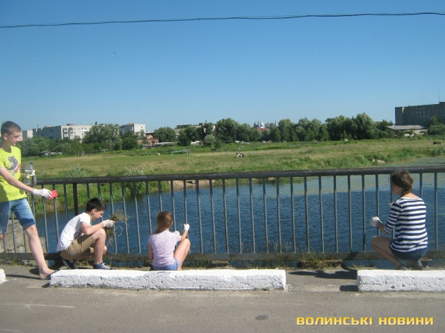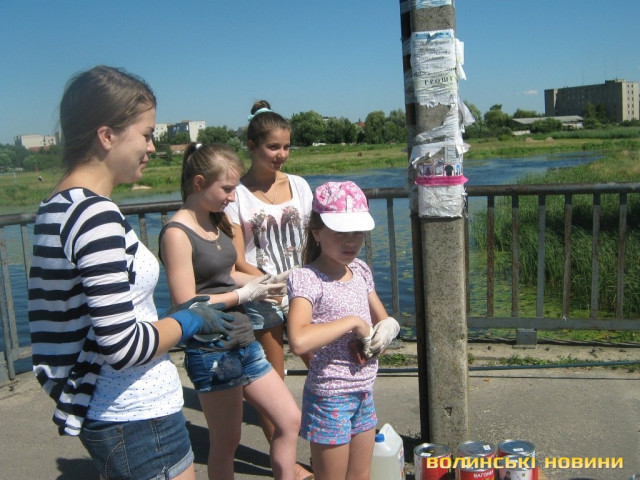 Одразу видно, що школярі самоорганізовані і свідомі. З надзвичайним завзяттям готували міст до двоколірного перетворення. Одні – протирали перила розріджувачем, інші – виривали зайву рослинність під мостом.