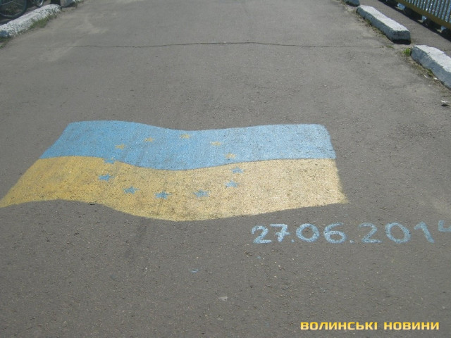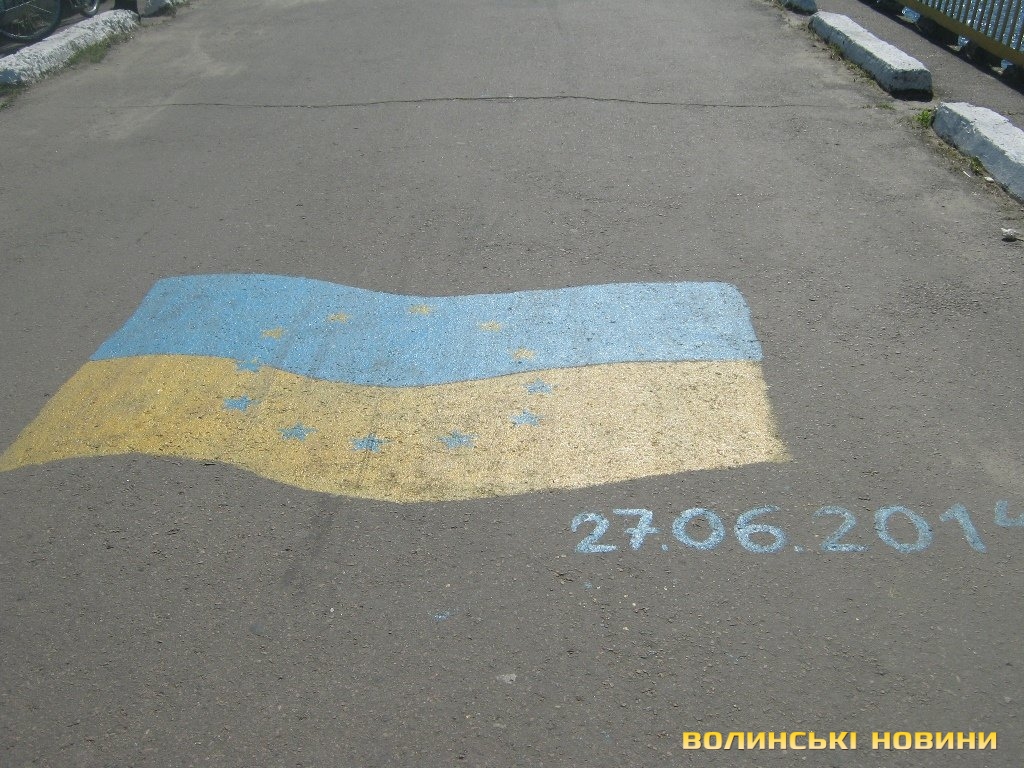 Ну і що? Тут на Заході ми всі прекрасно знаємо, що живемо в Україні!!! Ви таке краще б радили у Луганську і Донецьку малювати, а то враження, що у Луцьку просто немає чим занятись і гроші знаходять у такий скрутний час...