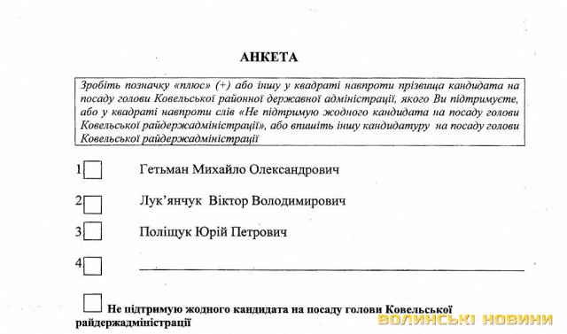 На завершення відбулося так зване «підсумкове анкетування», щоб, як заявила Галина Коляда, «наші сьогодні слухання не виглядали, що ми не можемо заявити про свою позицію». Участь у голосуванні взяли 45 чоловік: тільки сільські, селищні голови та районні депутати, оскільки «це самі ті люди, які представляють громадськість територіальної громади». Після підрахунку голосів з’ясувалося, що 33 з них бачать головою Ковельської райдержадміністрації Віктора Лук’янчука, 9 – Юрія Поліщука, 1 – Михайла Гетьмана, 2 – нікого не підтримали.