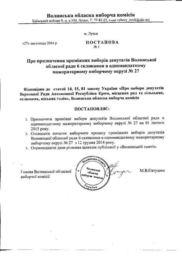 Призначити проміжні вибори депутатів Волинської обласної ради в одномандатному мажоритарному виборчому окрузі №27 на 1 лютого 2015 р.