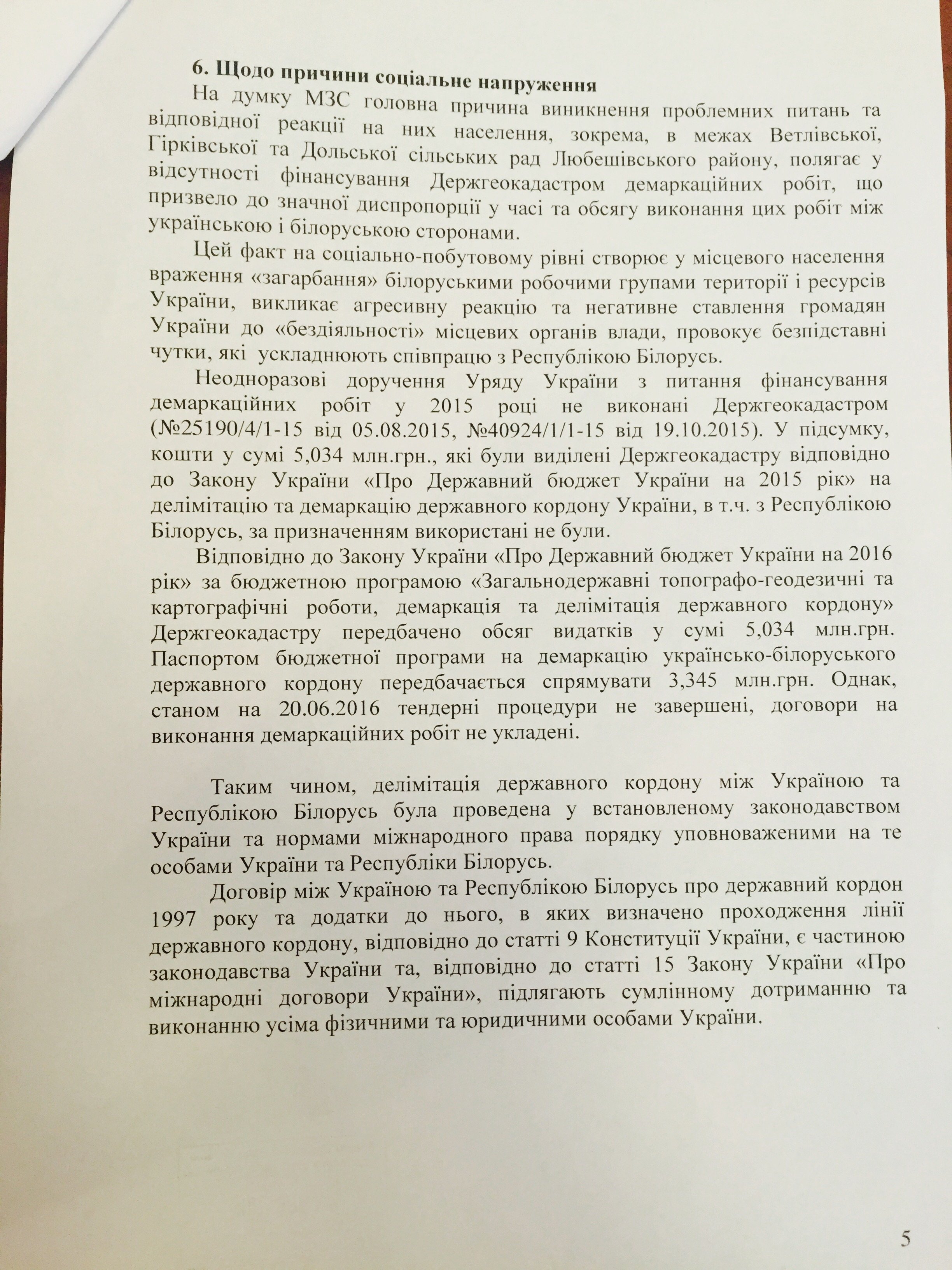 Крім того, в інформаційно-аналітичній записці, яка додається до відповіді, вказано, що головна причина виникнення проблемних питань з демаркацією у Любешівському районі на Волині – відсутність фінансування Держгеокадастром демаркаційних робіт, що викликало диспропорцію в їхніх обсягах та часі з українського та білоруського боків. «Цей факт на соціально-побутовому рівні створює у місцевого населення враження «загарбання» білоруськими робочими групами території та ресурсів України», – зазначає МЗС.