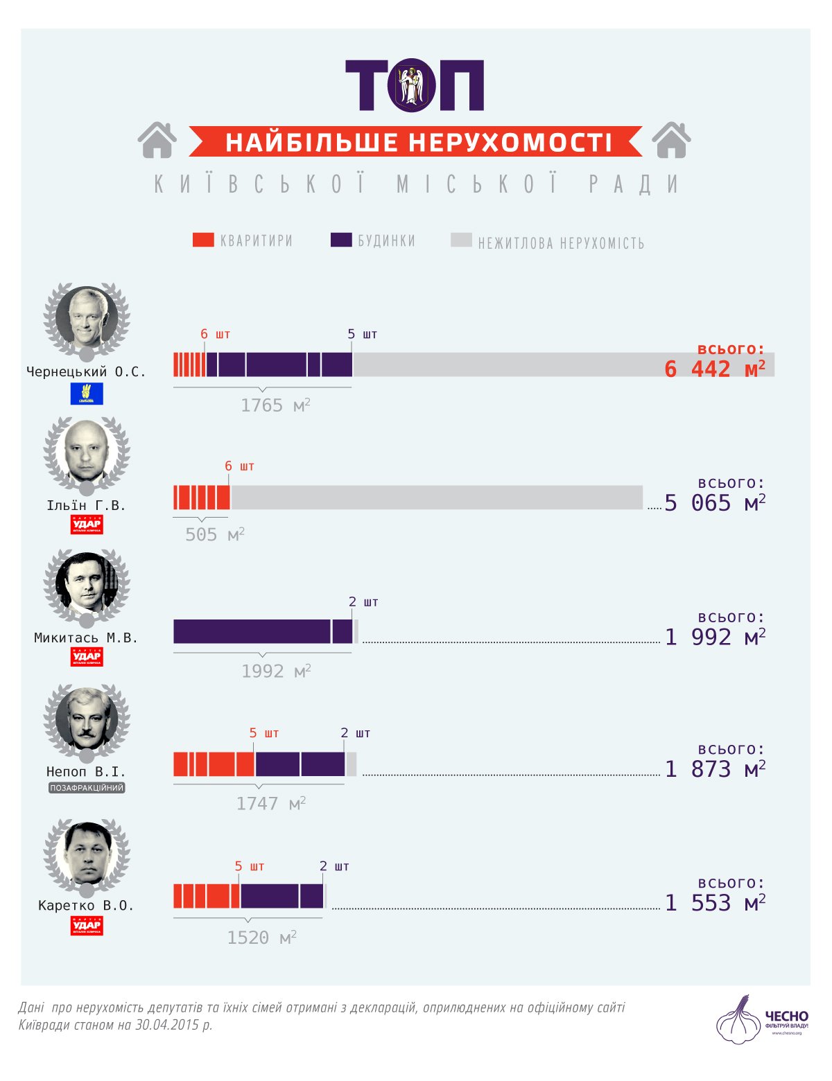Моніторинг декларацій депутатів Київської міської ради Громадського руху ЧЕСНО показав, що одні депутати, згідно з їх деклараціями, не мають власного житла, а інші володіють тисячами квадратних метрів. Список власників нерухомості очолив лучанин.