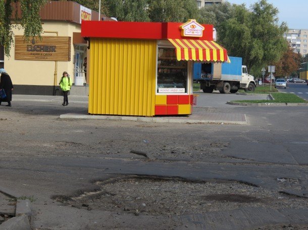 «Все це тягнеться ще з червня місяця, відколи відремонтували дорогу на Ветеранів. Тоді асфальт на дорозі зняли, але так і не доклали. А в додаток ще й поставили кіоск «Теремно Хліб» просто на тротуарі. Ось це взагалі абсурд. Так робиться по-європейськи чи ми так в Європу йдемо? Щоб посеред тротуару ставити кіоск!», - ділиться наболілим місцевий мешканець Олександр.