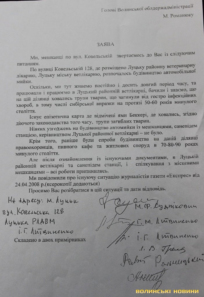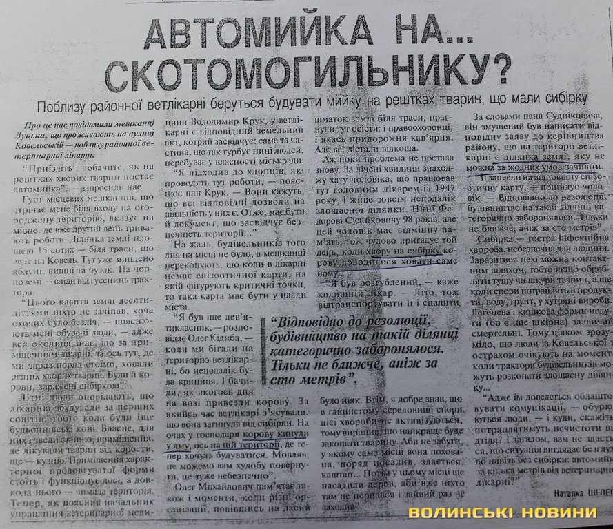 «Ми почали боротися із беззаконням ще з 2008-го року. А саме 24 квітня ми звернулися до тодішнього голови ОДА Миколи Романюка. Ми йому повідомили, що на місці могильника, порушуючи закони, будують автомийку. Зазначили, що там і раніше хотіли будуватися, однак, дізнавшись про поховання тварин, бізнесмени відмовилися. Просили розібратися з питанням», - говорить жителька прилеглого до мийки будинку Людмила Ковальчук.Із розпорядження Кабміну від 29 березня 2006-го року № 171-р видно, що в Луцьку на вулиці Ковельській, 128 дійсно була Луцька районна лікарня ветеринарної медицини.Згідно з державними будівельними нормами України, ветеринарно-лікувальні заклади державного управління мусять мати не менше 200 метрів санітарно-захисної зони між територією підприємства та межею житлової забудови.В інтерв’ю одній з газет, очевидці розповіли, що бачили, як на території ветлікарні ховали корову в яму. Ветеринар тієї клініки говорив, що сам хоронив тварину, до того ж, вона була хвора на сибірку – гостру інфекційну хворобу, яка небезпечна для людини.