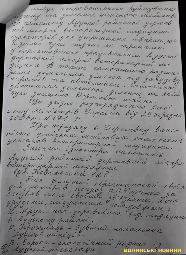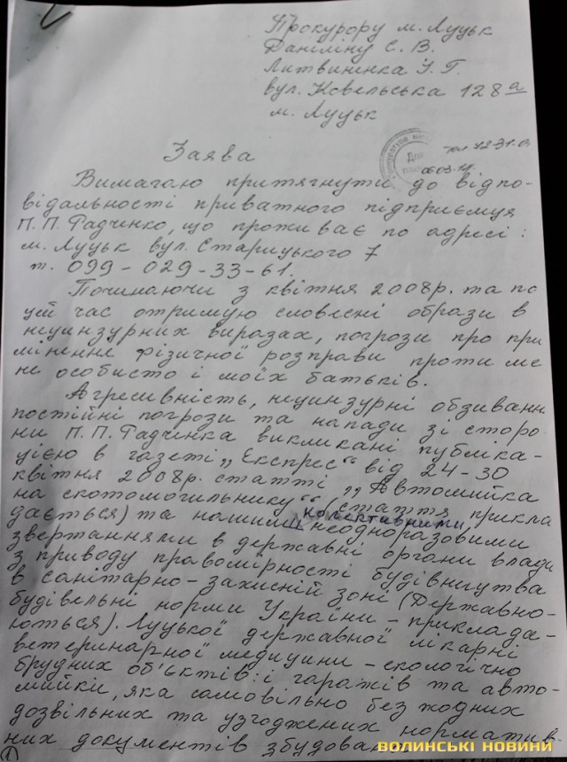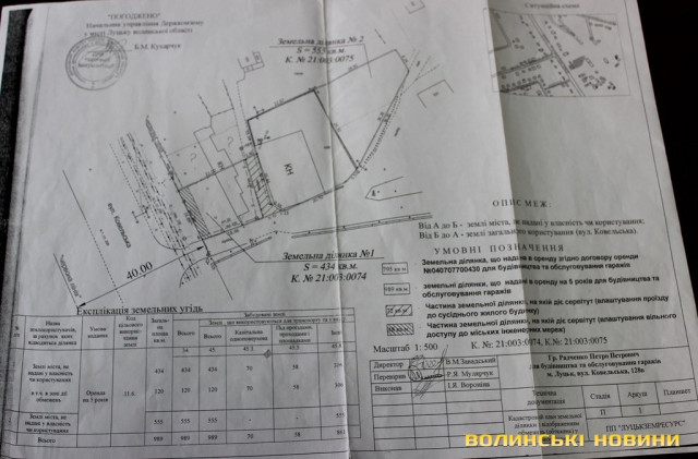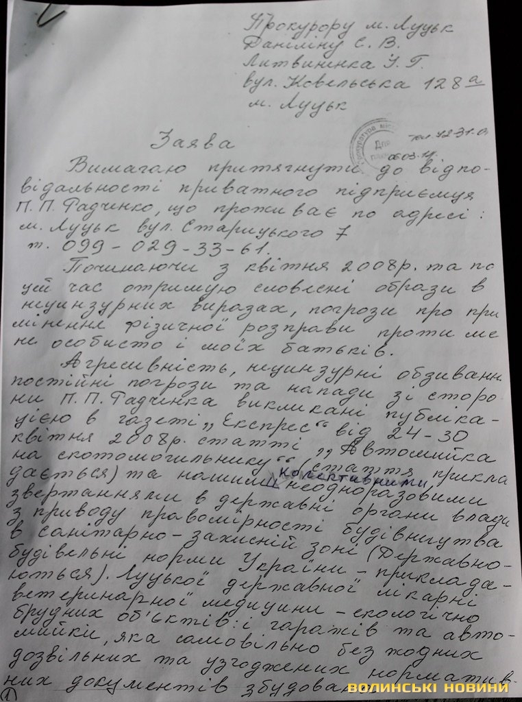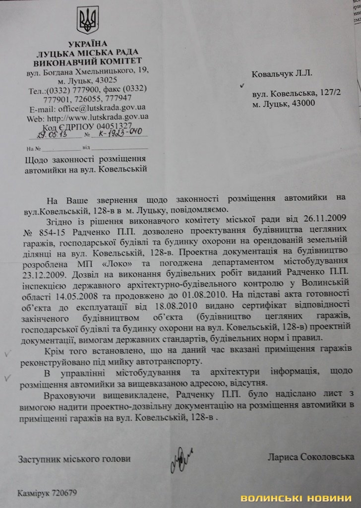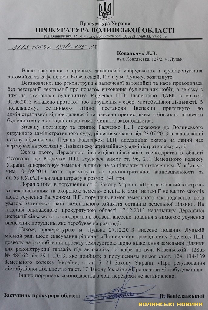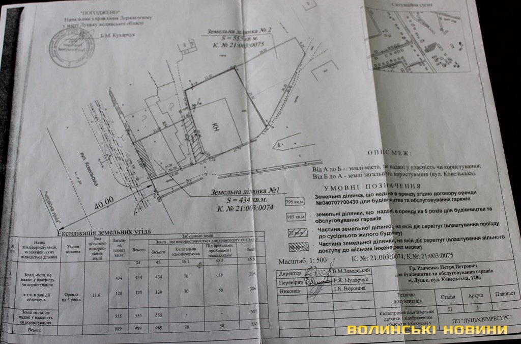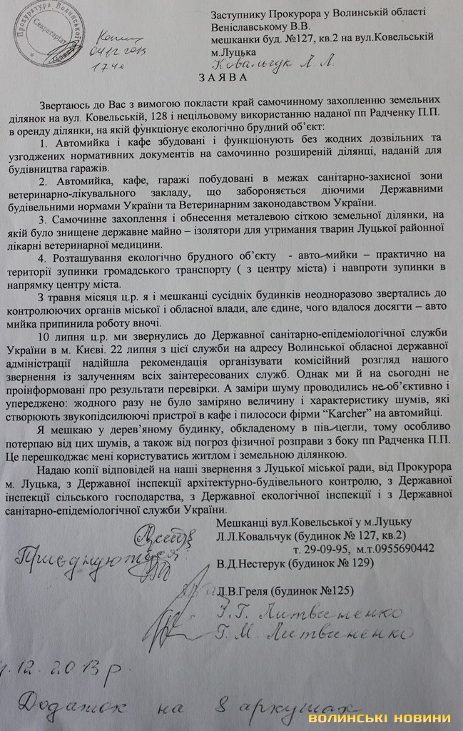 Людмила Ковальчук каже, що на звернення мешканців постійно дають відписки, що на конфліктній ділянці побудовані гаражі, які введені в експлуатацію в 2010-му році, а насправді ж, каже жінка, йдеться зовсім про іншу земельну ділянку: «Відверто брешуть, бо гаражі на ділянці, що надана в оренду згідно договору оренди №040707700430, а автомийка на ділянці кадастрового номеру 21:003:0074. Їх розділяє проїзд до житлового будинку».Мешканці звернулися в обласну прокуратуру.Заступник прокурора області Веніславський Вадим повідомив, що підприємець використовує земельні ділянки не за призначенням та що міська прокуратура винесла подання Луцькій міській раді про скасування рішення щодо дозволу на розробку проекту землеустрою бізнесмену Радченку П.П.