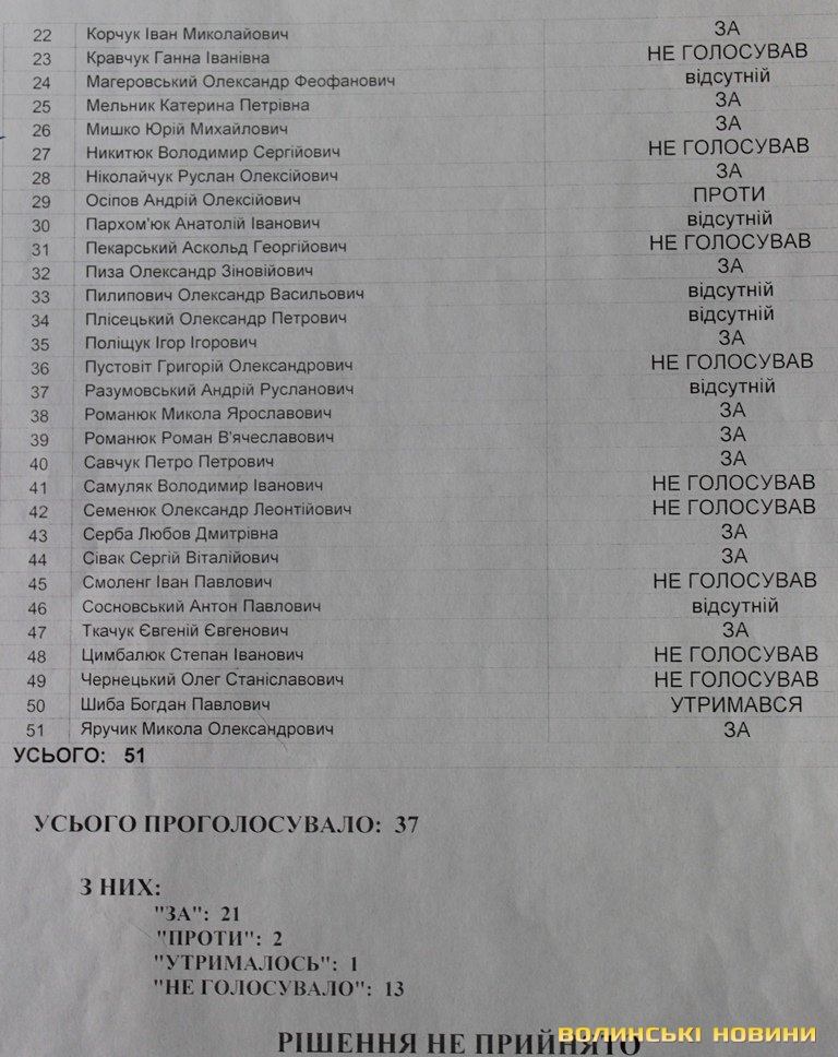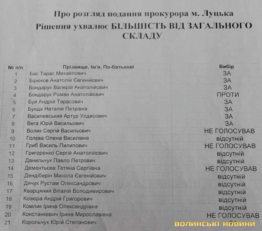 А хто не підтримав протест прокурора, а відповідно і людей... ба, усі знайомі обличчя з "народної" партії "Батьківщина"... Волик, Гриб, Кравчук, Никитюк, Пекарський, Пустовіт, Самуляк, Семенюк, Цимбалюк та Шиба.