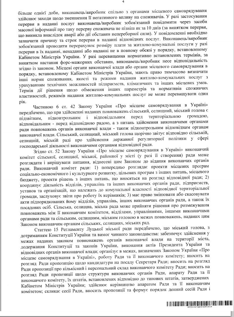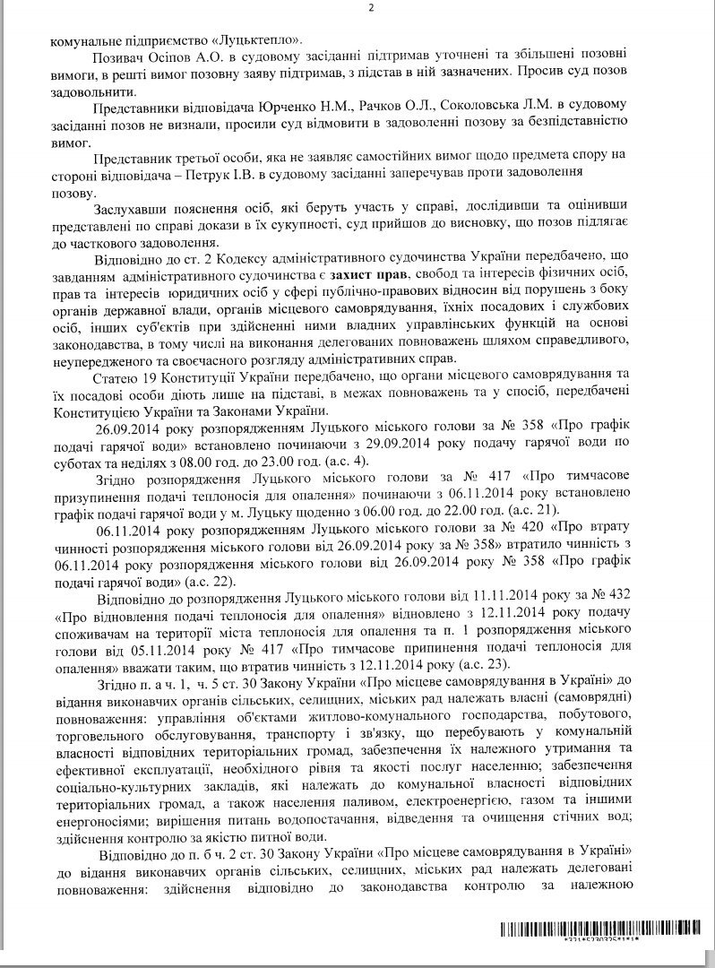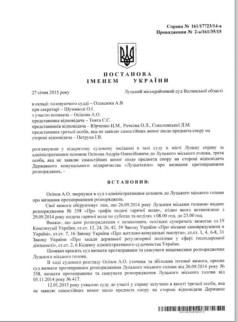 Сьогодні, 9 лютого, депутат Луцькради Андрій Осіпов надав текст рішення у справі про незаконність обмеження подачі гарячої води за розпорядженням Луцького міського голови.