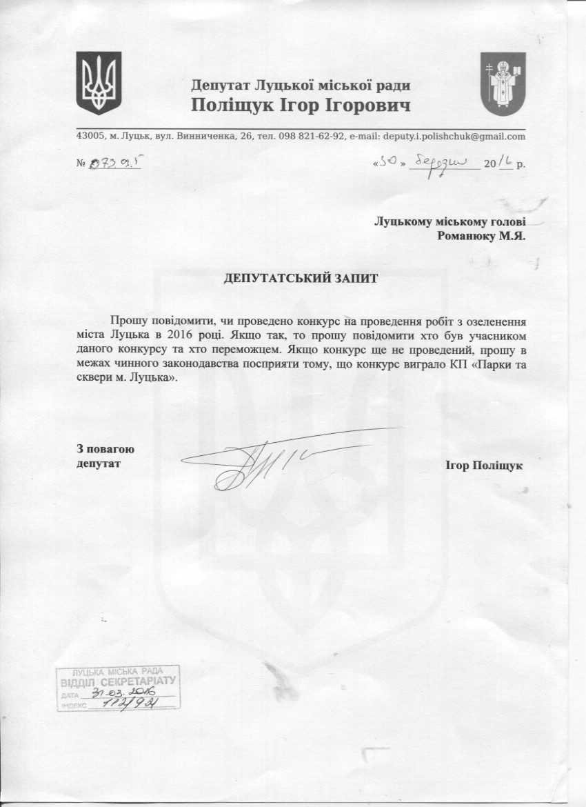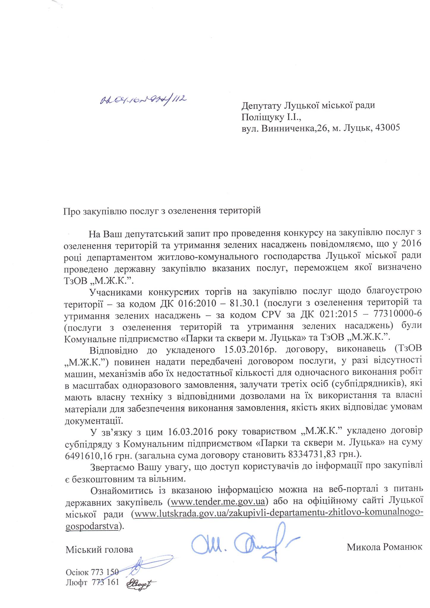 Так, під час 5 сесії Луцької міської ради депутат Ігор Поліщук озвучив запит щодо озеленення міста. Зокрема, він поцікавився, чи вже були проведені конкурсні торги на проведення робіт з озеленення міста і хто є переможцем.З відповіді, яка надійшла депутату за підписом Луцького міського голови Миколи Романюка, стало відомо, що переможцем визначено ТзОВ «М.Ж.К.».