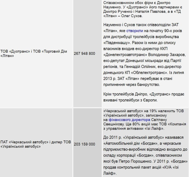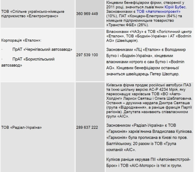 У десятку також потрапили корпорація «Еталон» (297,54 млн грн.), «Черкаський автобус» зі своїм акціонером «Українським автобусом» (203,16 млн грн.), дилери дніпровського «Південмашу» – «Дуотранс» і «Торговий Дім «Літан» (267,95 млн грн.) та дилер білоруського «Белкомунмашу» – «СП «Янікс» (70,92 млн грн.).