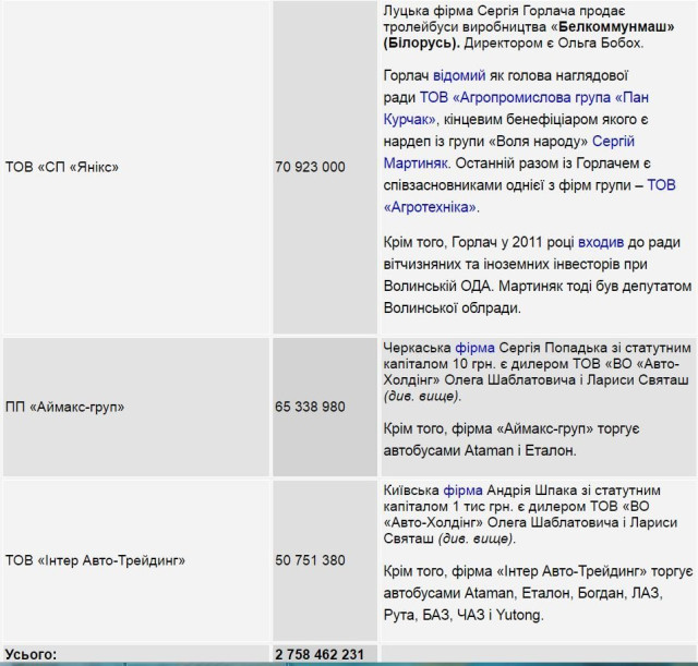 Із 1 березня 2014 року по 12 грудня 2016 року місцеві органи влади уклали угоди про закупівлю нових та вживаних автобусів і тролейбусів на майже на 3 млрд грн. Більшість із цих коштів (90%) отримали десять постачальників.