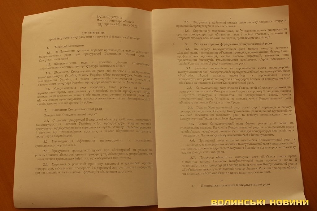 На початку засідання тривали гострі дискусії з приводу тих, хто має бути в цій структурі. Зокрема насторожував учасників такий факт, що з 17-ти представників 5-ро - колишні працівники прокуратури. Однак прокурор Волинської області Анатолій Коцура переконав присутніх, що в дорадчому органі повинні бути професіонали справи. Так, представники громадської ради планують брати участь в обговоренні кадрових рішень, приймати звернення від людей та інформувати про це керівництво.Положення про Консультативну раду при прокуратурі Волинської області затверджене наказом від Прокуратури Волинської області № 15 від 05 травня 2014-го року.Учасники засідання прийняли перші свої рішення, зокрема обрали голову й секретаря.
