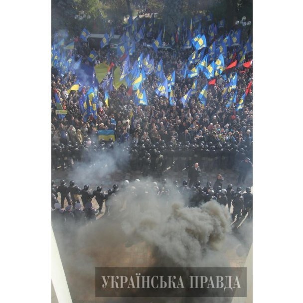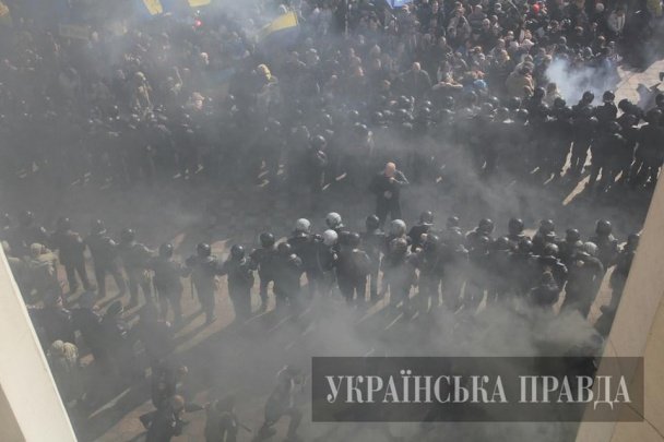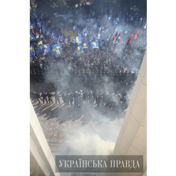 До центральних дверей ВР близько півдня почали кидати димові шашки та вибухові пакети. Досить часті вибухи лунають і на Грушевського.