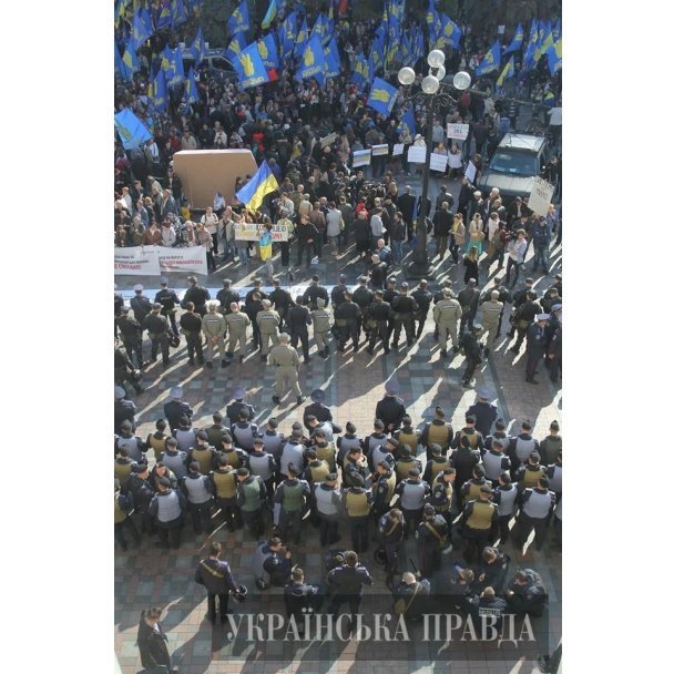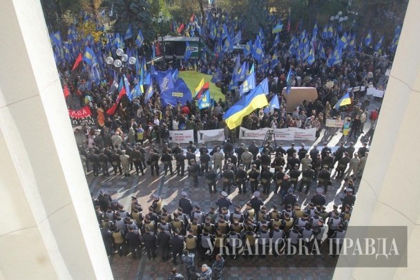 Останнє засідання Верховної Ради перед виборами відбувається неспокійно Переважна більшість пікетувальників під парламентом стоять під прапорами ВО "Свобода", вони за рахунок партії приїхали з різних куточків України. Люди зібрались під Радою з різних приводів, але здебільшого вимагають прийняття законів про статус біженців та антикорупційного пакету. Депутат Леонід Ємець повідомив про те, що у вікнах Верховної Ради з'явились дірки, ймовірно, від куль.