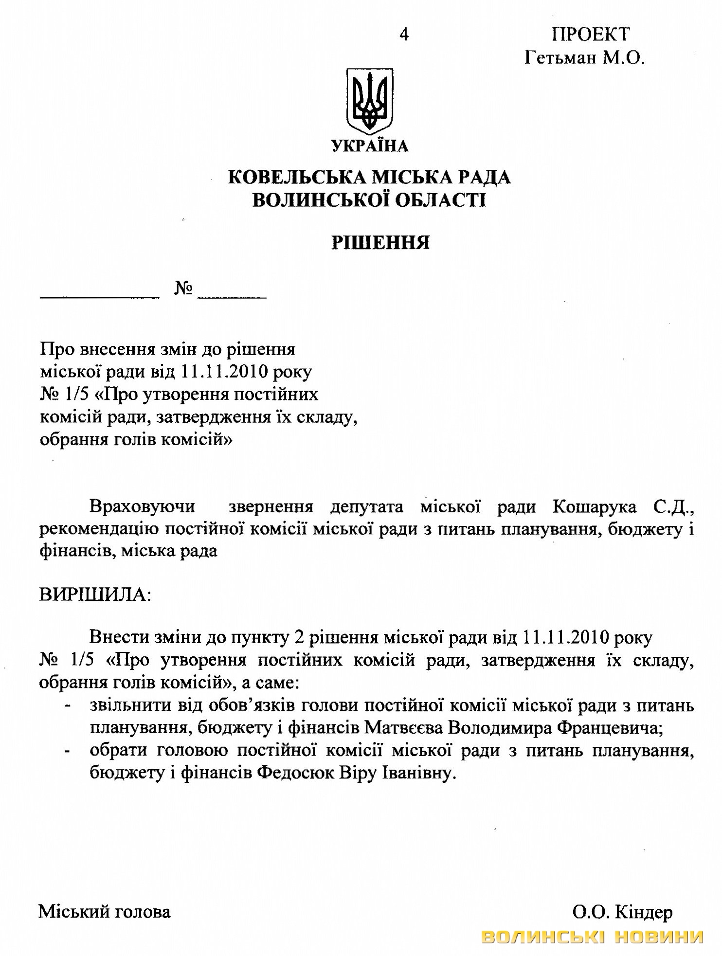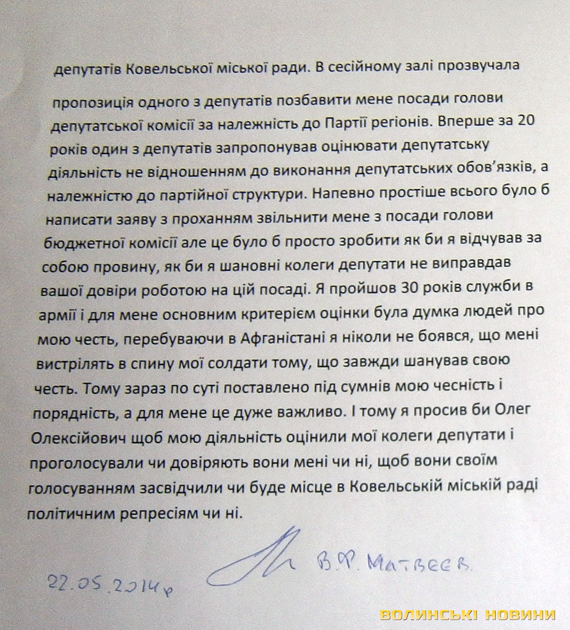 "Крім цього, він попросив розглянути питання доцільності перебування головою депутатської бюджетної комісії керівника ковельських регіоналів Володимира Матвєєва, мотивуючи тим, що недоречно, щоб у такий час «ми дозволяли таким людям займати подібні посади і мати впливи на розподіл бюджетних коштів». С,Д Кошарук 25,05,2014р,