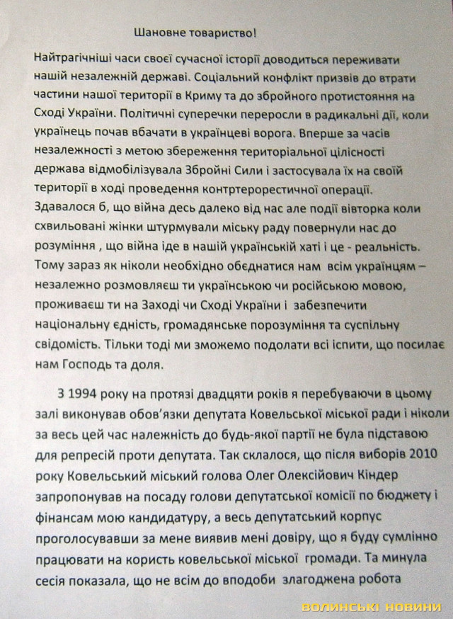 А уже наступної сесії, що відбулася минулого тижня, Володимир Матвєєв з трибуни озвучив заяву, яка закінчувалася такими словами (орфографію збережено): «…я просив би Олег Олексійович щоб мою діяльність оцінили мої колеги депутати і проголосували чи довіряють вони мені чи ні, щоб вони своїм голосуванням засвідчили чи буде місце в Ковельській міській раді політичним репресіям чи ні». Як не дивно, але градоначальник у щирому і сміливому проханні обранця народу та свого політичного конкурента на виборах не виконав, чим, по суті, наплював і на закон, і на мораль.