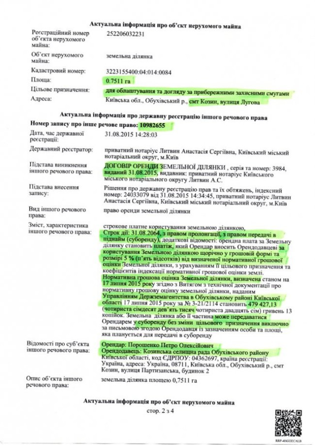 Договір оренди на ділянку водоохоронної зони укладено 31 серпня 2015. Згідно з цією угодою, Петро Порошенко на правах оренди може розпоряджатися цією ділянкою до 2064 року з правом подальшої пролонгації, а також може передавати його в суборенду третім особам без зміни цільового призначення.